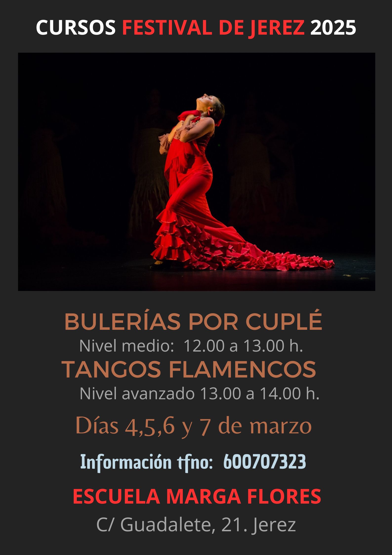 Dirección: Escuela Marga Flores en C/ Guadalete número 21 de Jerez. Toda la información en el teléfono: 600 70 73 24