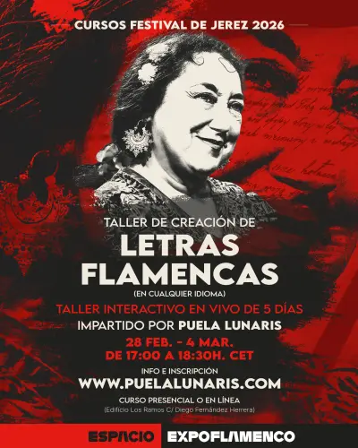 17,00 a 18,30 horas Taller de creación de letras flamencas (en cualquier idioma, 5 días de duración modalidades presencial y online) por Puela Lunaris.