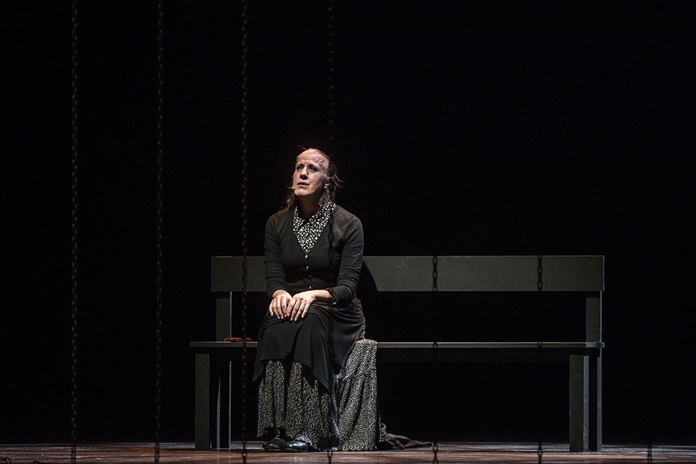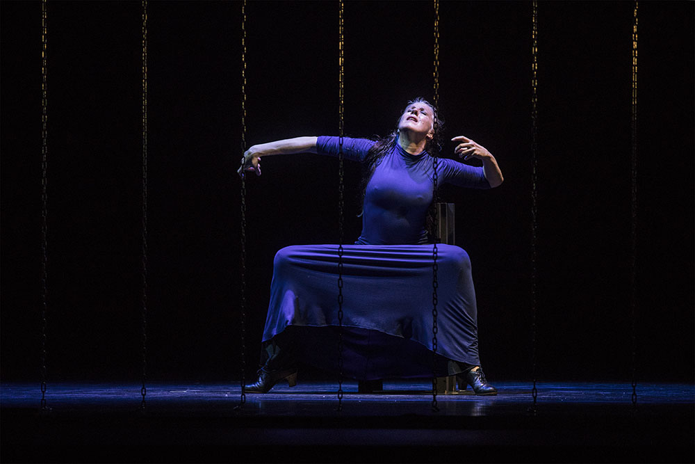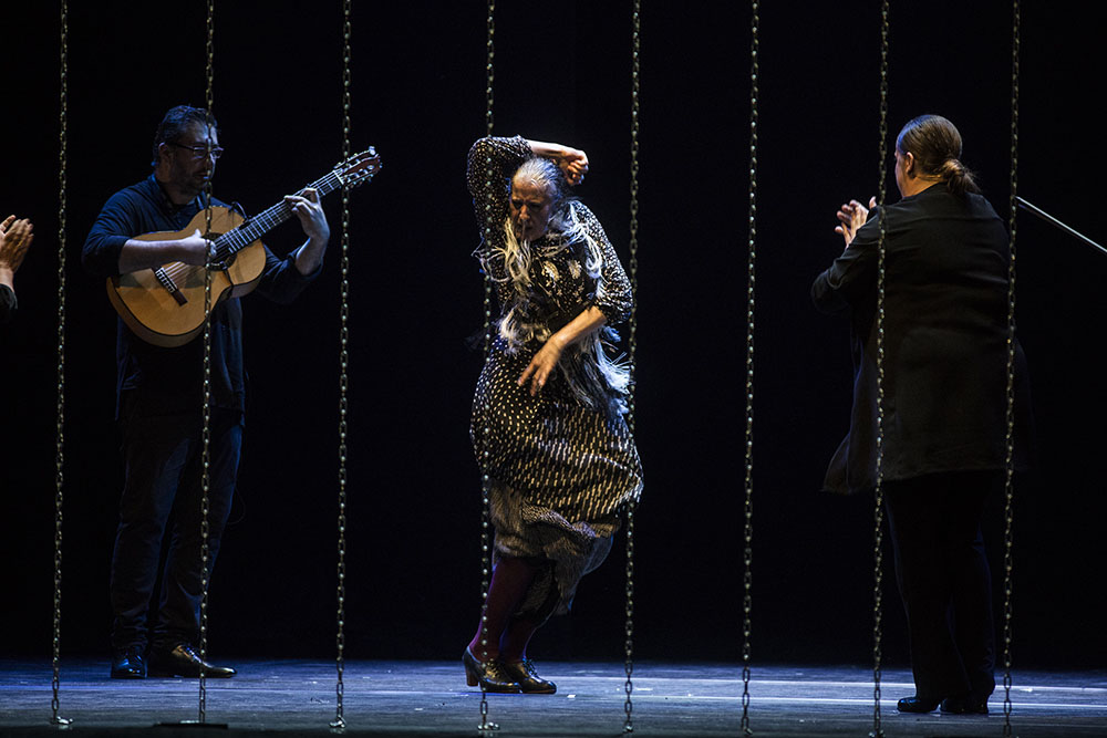 He dejado para el final un detalle escénico fundamental: unas largas cadenas que cuelgan de arriba abajo del escenario durante toda la obra, simulando los barrotes de una prisión. Al cabo de un rato viendo esa separación entre artistas y público, era fácil persuadirse de lo extremadamente grosero y violento que puede resultar para dos seres humanos una jaula, una valla, una frontera infranqueable. Era la mejor metáfora de este montaje, pero demasiado dura para soportarla durante casi una hora y media. Aunque el baile acabara ejerciendo su efecto liberador, el público salió del teatro necesitando un abrazo, un cante por alegrías o al menos un amontillado de Cayetano del Pino para sacudirse la desolación.