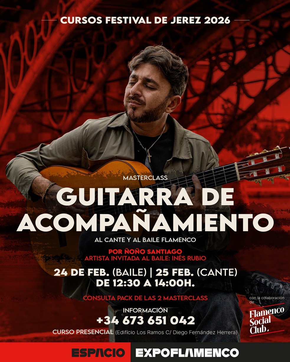 Clase centrada en el acompañamiento al baile por soleá, abordando en profundidad la estructura, las llamadas, los cierres, los remates y el diálogo real entre guitarra y baile. Los alumnos podrán preguntar, resolver dudas y comprender el concepto del acompañamiento desde una perspectiva práctica y musical. La clase se realizará con la bailaora Inés Rubio como artista invitada, para poner en práctica el acompañamiento real al baile, con ejemplos concretos y situaciones reales de escena. Nota: La participación en los dos cursos de Ñoño tienen un precio reducido.