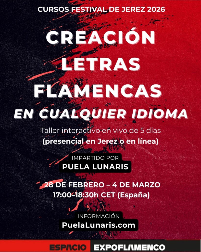 Este taller está basado en la experiencia de Puela Lunaris como letrista, arreglista y productora musical de su álbum Duende Flamenco con letras en inglés y español que cuenta con distribución digital internacional. Así como el hip-hop y el jazz ya se cantan en muchos idiomas, la comunidad flamenca internacional también siente la necesidad de expresarse en sus lenguas nativas. Por eso este taller llena un vacío importante en la internacionalización del flamenco.