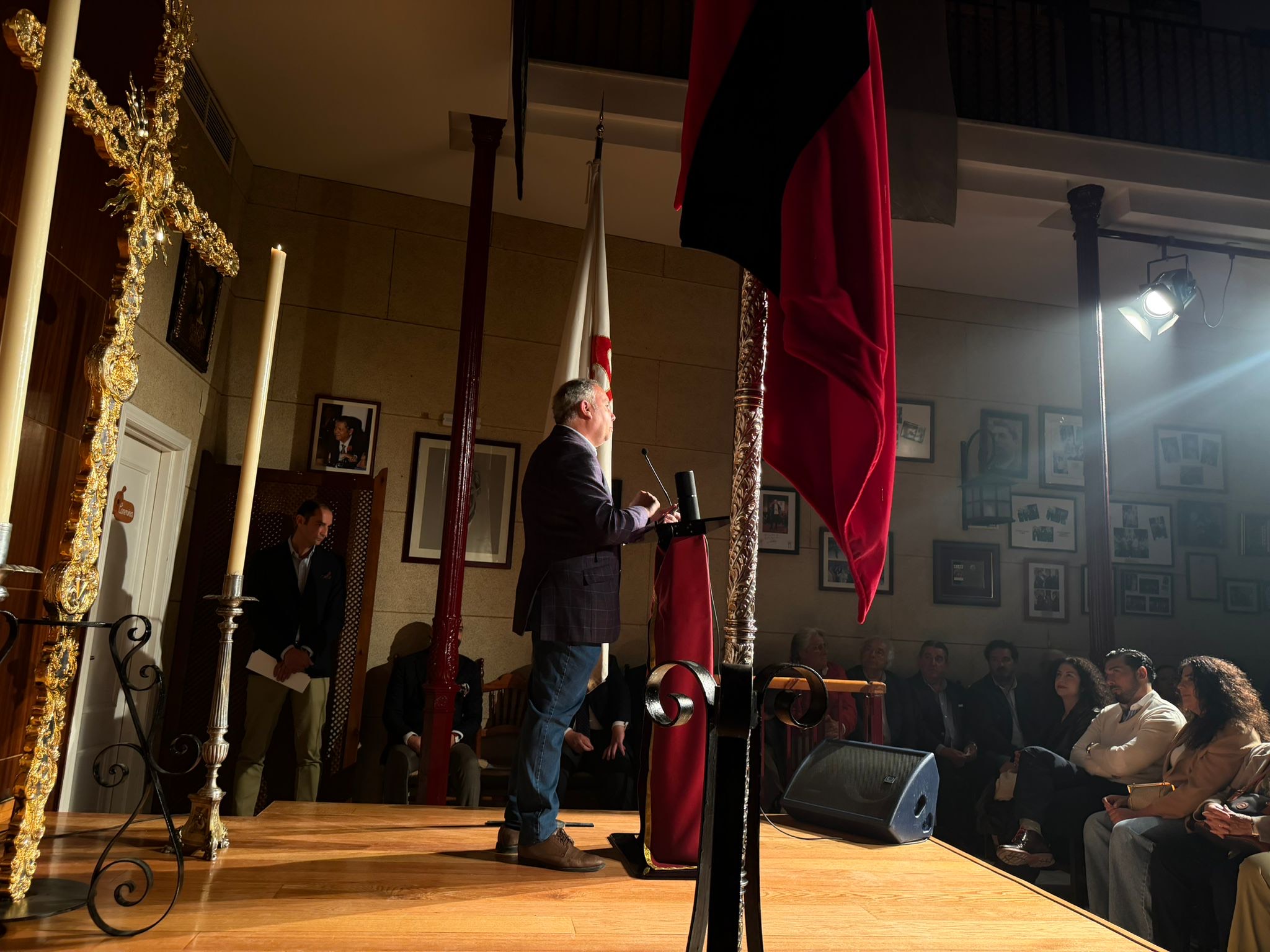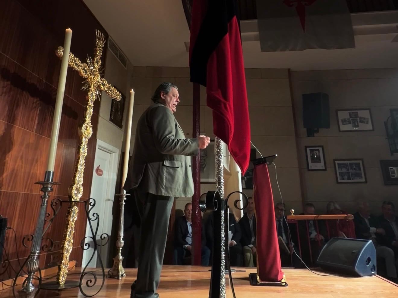 El compañero José María Castaño comenzó disertando sobre la figura de Curro apoyándose en grabaciones que recogió en su día como una soleá junto a Periquín Niño Jero en la antigua sede de la peña, aquella pequeñita que sirvió de cuarto de cabales cada fin de semana. Escuchamos la saeta de “las manos del Prendimiento son dos lirios encendíos…”, que nos dejó sin apenas aliento para continuar. Las propias hermandades del Prendimiento, Buena Muerte, Jesús Nazareno, la del Transporte y la de los Judíos de San Mateo llevaron enseres a modo de banderas y colgaduras (reposteros) que sirvieron para dar aún más categoría al acto. Cabe mencionar la Cruz de Guía de la hermandad de San Mateo presidiendo el escenario. Posteriormente fueron los versos (y la prosa) de Antonio Gallardo Monje, Ángel Rodríguez Aguilocho y Andrés Villagrán las que enaltecieron las cualidades y singularidades de Curro de la Morena, sobre todo en la saeta, recibiendo grandes aplausos del respetable. Fueron pequeños destellos de genialidad los que se escucharon, que parece fácil, pero… ¡qué difícil es escribir!