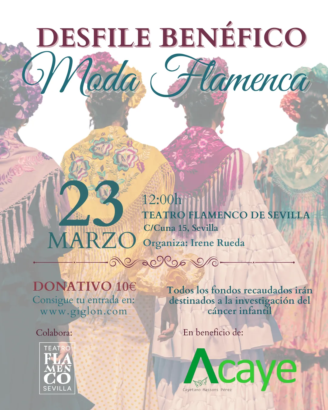 En el marco de su labor social, Teatro Flamenco Sevilla acogió el domingo 23 de marzo a las 12 horas un desfile benéfico de moda flamenca a favor de la investigación del cáncer infantil. El evento contó con la participación de los diseñadores Hermanas Serrano, Juan Manolo, Ana Morón y La Parrala.