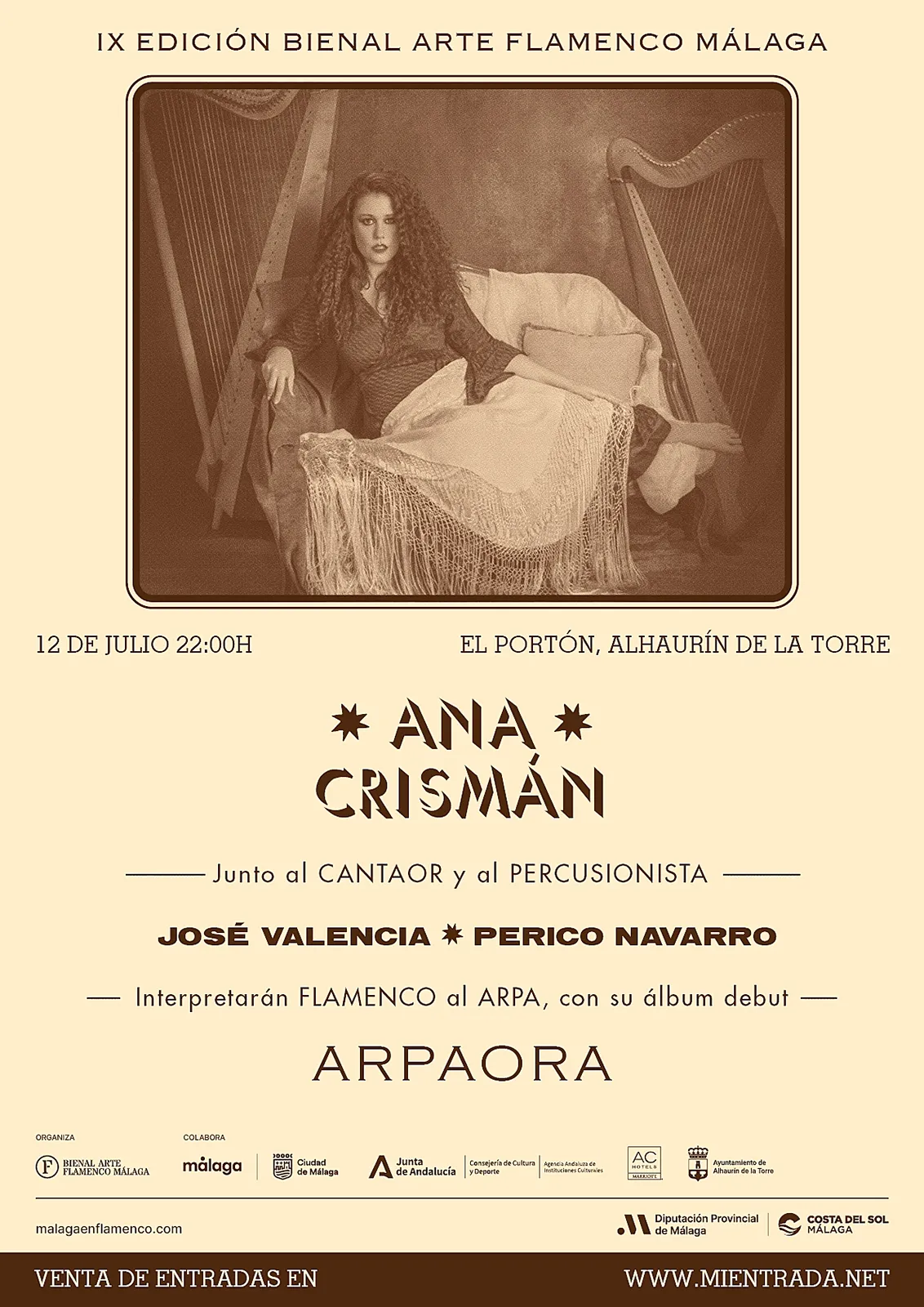 El sábado 12 de julio, a las 22 horas, El Portón (Alhaurín de la Torre) acoge el espectáculo Arpaora, protagonizado por Ana Crismán, que cuenta con la colaboración de José Valencia como artista invitado y el percusionista Perico Navarro.