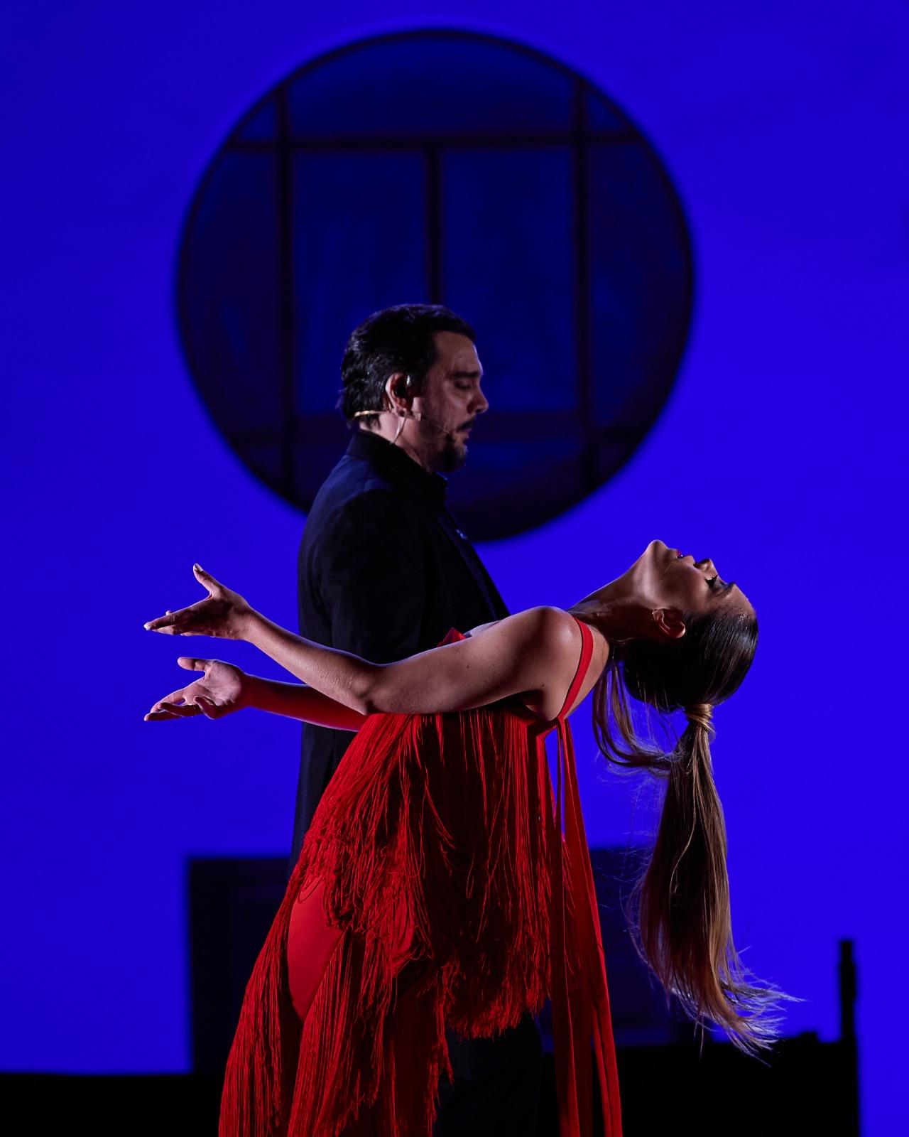 Lucía La Bronce abrió bordando un pasaje protagonizado por el mantón. La música pregrabada la rubricaba Arturo Pavón. Parte del cuerpo de baile –Adriana Gómez, Ángel Fariña, Blanca Lorente, David Vargas, Lucía La Bronce y Jasiel Nahin, según figura en el programa– danzó la caña, musicalizada con exquisita originalidad por el guitarrista Jesús Rodríguez, espléndido en la composición y al toque, como su compañero en la bajañí José Luis Medina, el cante de Amparo Lagares, Manuel de Gines y Sergio El Colorao y la precisa percusión de David Chupete. María Carrasco brilló en la petenera. Intensa, profunda, henchida de jondura. Lo hizo al socaire de la garganta melosa, contenida, sensible y bien timbrada de Manuel de Gines, que rizó la remediaora y el quisiera yo renegá de La Niña de los Peines con vaivenes sedosos. María culminó su baile igual que empezó: con los volantes de la bata alzados, ocultando su rostro. Prosiguieron algunos componentes del elenco masculino –Álvaro Aguilera, Arturo Fajardo y Hugo Aguilar– con virajes de rodillas, castañuelas y pasos clásicos evocando con pulcritud ecos lorquianos en la memoria, por verdiales. Araceli Muñoz descolló con elegancia en los marcajes y flamencura en los contoneos al llegar a los corridos y romances junto a la utrerana Sofía Suárez y la granaína Claudia La Debla, portento de bailaora de insultante juventud. Tremendos los cantaores en esta pieza.