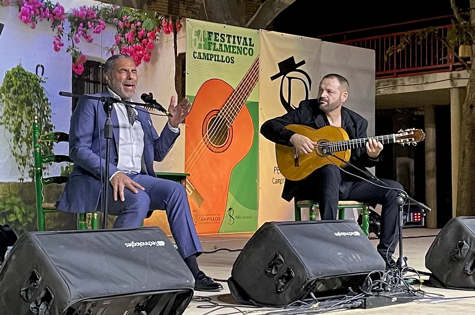 Y para terminar, cuando las manillas del reloj apuntaban a la una y media de la mañana, Jesús Méndez, como un vendaval jerezano que atraviesa con su metal cualquier corazón sensible. Es otra de las garantías de estos tiempos, requerido y respetado, se deja un trocito de piel cada vez que se enfrenta al público. Creo que está en un momento cumbre, con un dominio escénico fuera de lo normal y cantando como un verdadero maestro, aunque por edad aún no se le diga. El temple por soleá, el compás en las alegrías, o bulerías… Luego esa armonía que aporta en el escenario con Pepe del Morao a la guitarra, de casta le viene al galgo, y dos (ases) palmeros como Cantarote y Diego Montoya. Campillos no solo es esa carretera de paso entre capitales de provincia, sino una gran familia que acoge a los buenos flamencos.