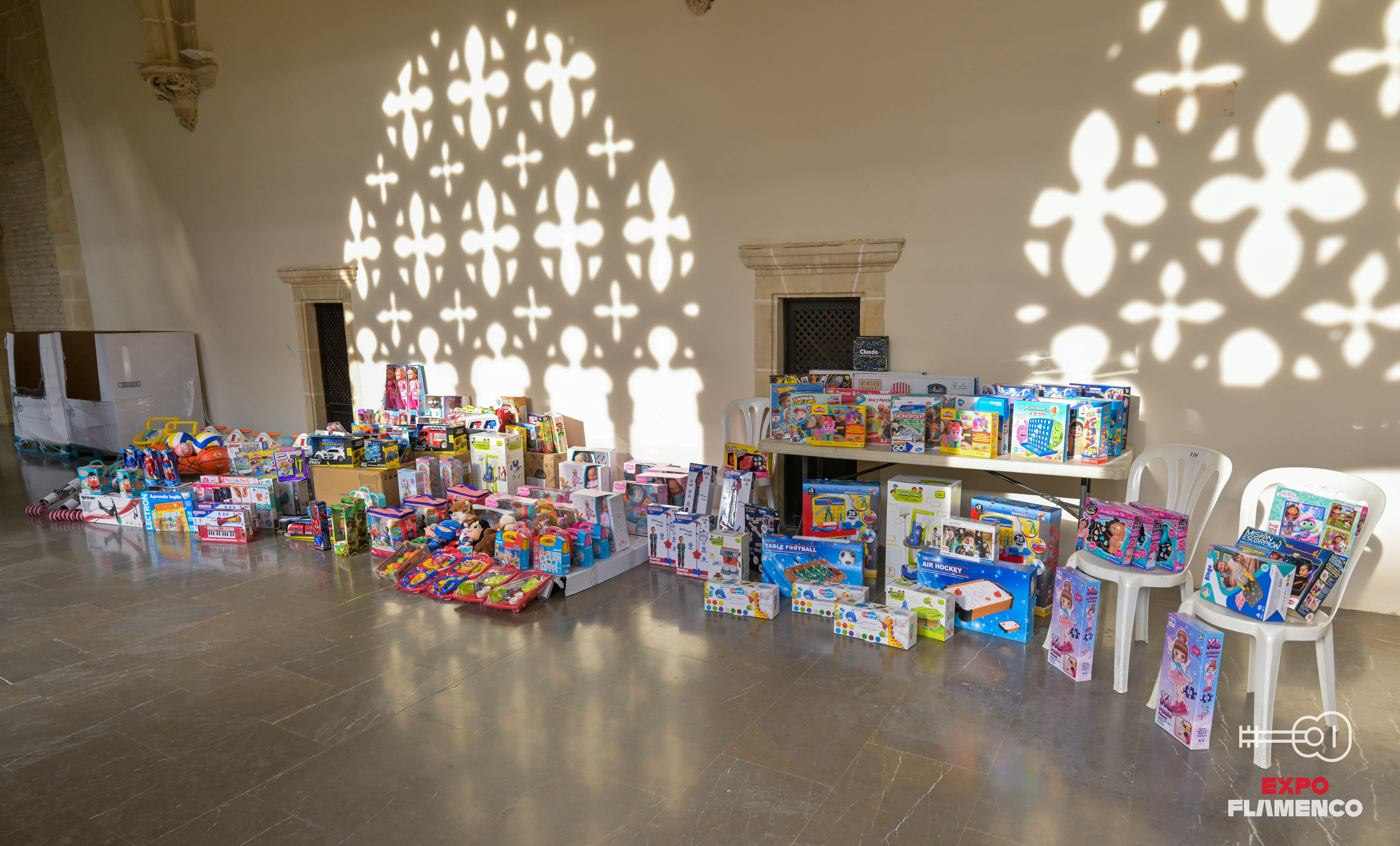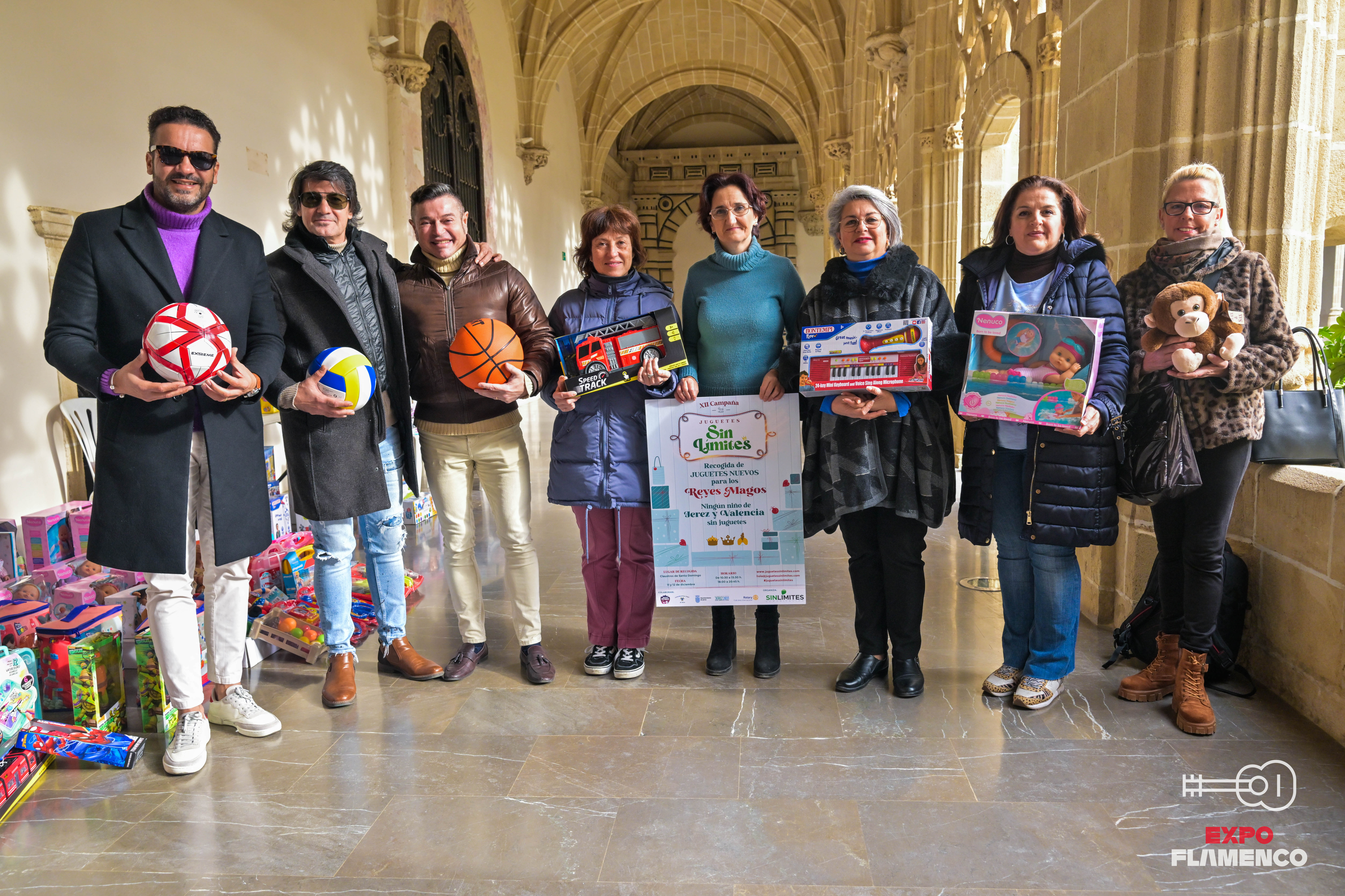 En la mañana de 11 de diciembre, ha tenido lugar en Los Claustros de Santo Domingo la prometida entrega de un buen número de juguetes para la campaña de Los Reyes Magos de Jerez por parte del II Memorial Ana Téllez. La feliz idea partió de Flaco Producciones, una oficina artística que integran el bailaor Joaquín Grilo y Nuria Figueroa, su mujer.