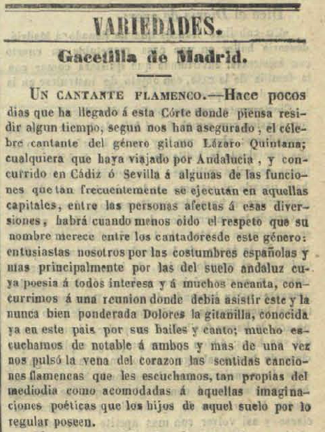 «UN CANTANTE FLAMENCO.- Hace pocos días que ha llegado a esta corte donde piensa residir algún tiempo, según nos han asegurado, el célebre cantante del género gitano, Lázaro Quintana. El nombre de este célebre «quirrabaor» es generalmente apreciado entre los aficionados de Sevilla, Cádiz y el Puerto» (El Clamor público, 8 de junio de 1847). [7]