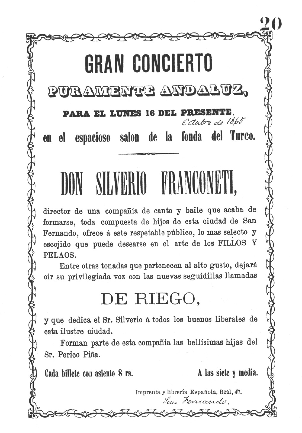 Hay que señalar que, en un principio, el uso del término flamenco para referirse a una música o baile no implica ninguna diferencia musical especial, o forma de interpretación que se aleje de lo que antes era calificado de andaluz. Es decir, el que se califique de «cantante flamenco» a Lázaro Quintana en 1847 no significa que su cante sonara a flamenco, tal y como lo entendemos ahora. En este sentido del uso del término o no, es muy elocuente la figura de Silverio Franconetti y ver cómo se anunciaba en sus espectáculos. En prácticamente ningún cartel de los recitales de Silverio se habla de «cante flamenco», ni «cantaor flamenco». Silverio Franconetti, “el creador del género flamenco” según Demófilo, se anunciaba como «cantador andaluz» desde que hay noticias de la apertura de su café, el 28 de abril de 1881, hasta los últimos mensajes de finales de 1888 [1]. Igualmente ocurre en los recitales que hizo en Córdoba [2] desde 1871, donde encontramos siempre la denominación género andaluz» para los cantes y bailes de él y su compañía (Francisco Hidalgo y José Lorente como cantadores, Antonio el Raspador, Antonio Páez El Pintor y Antonio Andrade como bailadores y Antonio Pérez como guitarrista, aunque también bailaba). Solo una vez se tilda de «flamenco» su espectáculo en Córdoba: en 1886, época en la que ya se había impuesto este término como genérico; y lo hace la prensa, no figura en su propia publicidad. Como muestra de esto que comentamos, fijémonos en este cartel [3] del 16 de octubre de 1865: