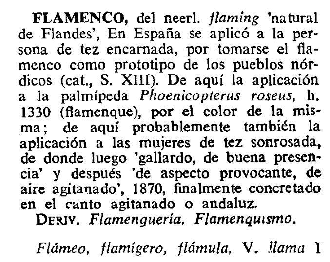 Corominas, en su diccionario etimológico (3ª edición de 1987), propone un origen germano del término flamenco: