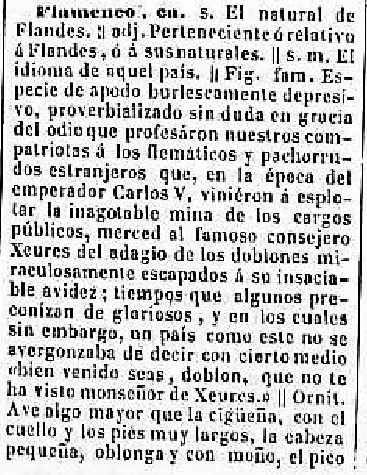 El Diccionario de Gaspar y Roig de 1853 recoge todos estos y añade el calificativo despectivo de la voz «flamenco» como apodo burlescamente depresivo y asociado a los extranjeros venidos de Flandes en la época de Carlos V. Vean: