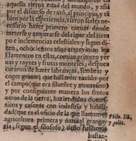 «[…] y así, por el discurso de Raçon, al principio, y también por la experiencia, vieron serles necesario, hacer primero Cuevas, donde meterse, y ampararse del rigor del tiempo, e inclemencias Celestiales; y segun dicen, ochocientos Años atrás, vivian los Flamencos en ellas: comían primero Yerbas, y raices, y frutas Monteses, despues curaron de hacer Labranças, sembrar y coger Grano, que hallaron nacido por el Campo […] [14]»
