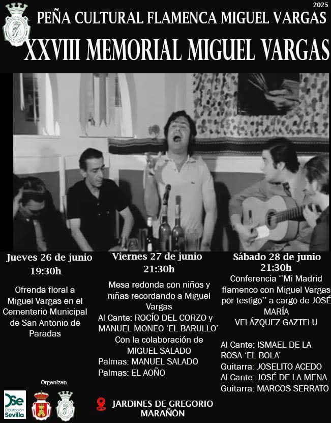 La Peña Cultural Flamenca Miguel Vargas de Paradas sigue recordando a su titular. Y no solo recordándolo, sino haciéndole honores a lo mucho que significó, y significa, en las plazas, en sus calles, en su tradiciones, en su cultura y en sus cosas.