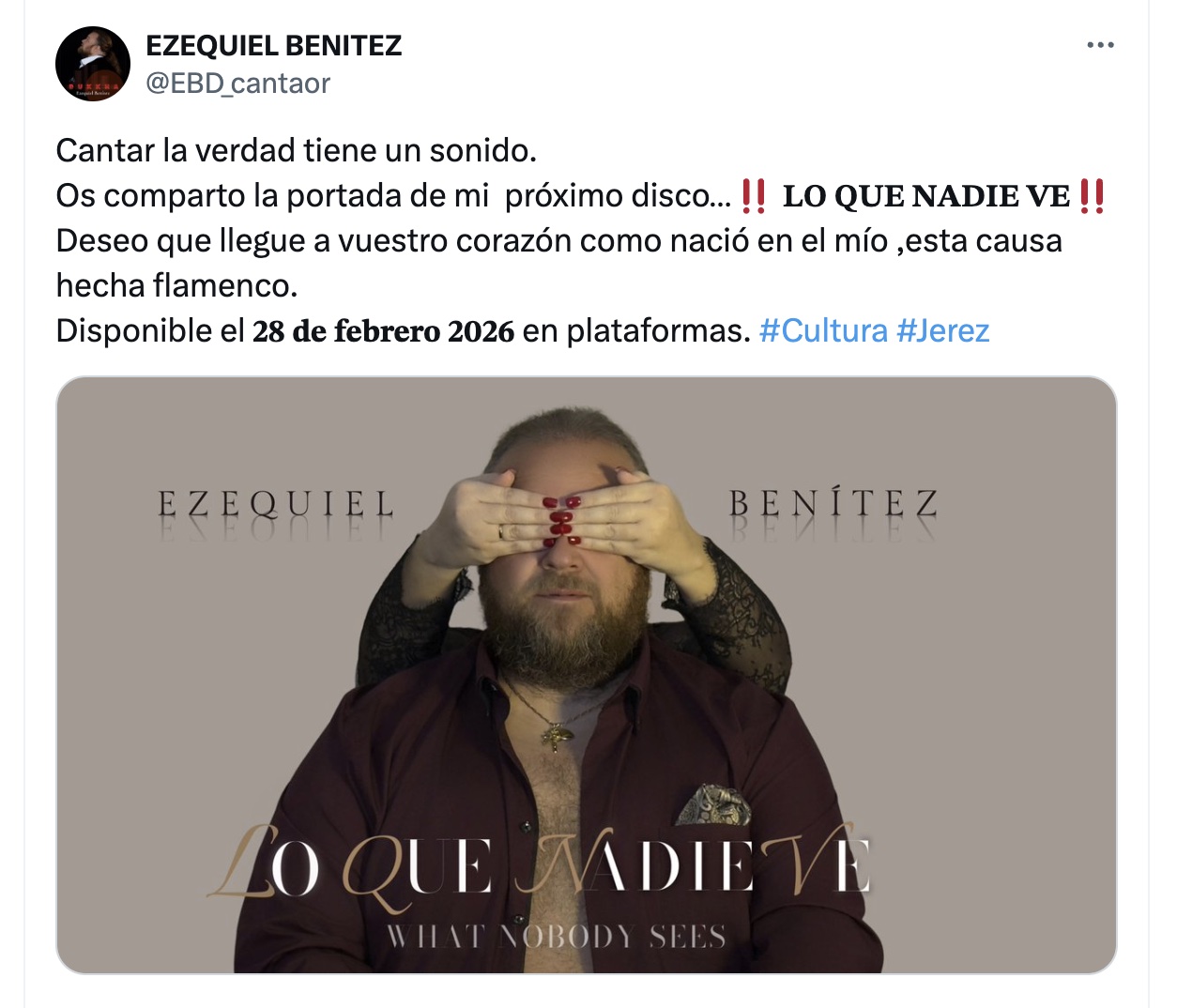 Lo que nadie ve es el reflejo de todo lo que ocurre detrás de la vida y la ceguera humana. Es la lucha invisible, el sacrificio constante y el amor profundo que mueve cada nota, cada paso. El cantaor jerezano Ezequiel Benítez nos lleva de la mano a ese mundo oculto, donde el arte no solo es creación, sino también causa.