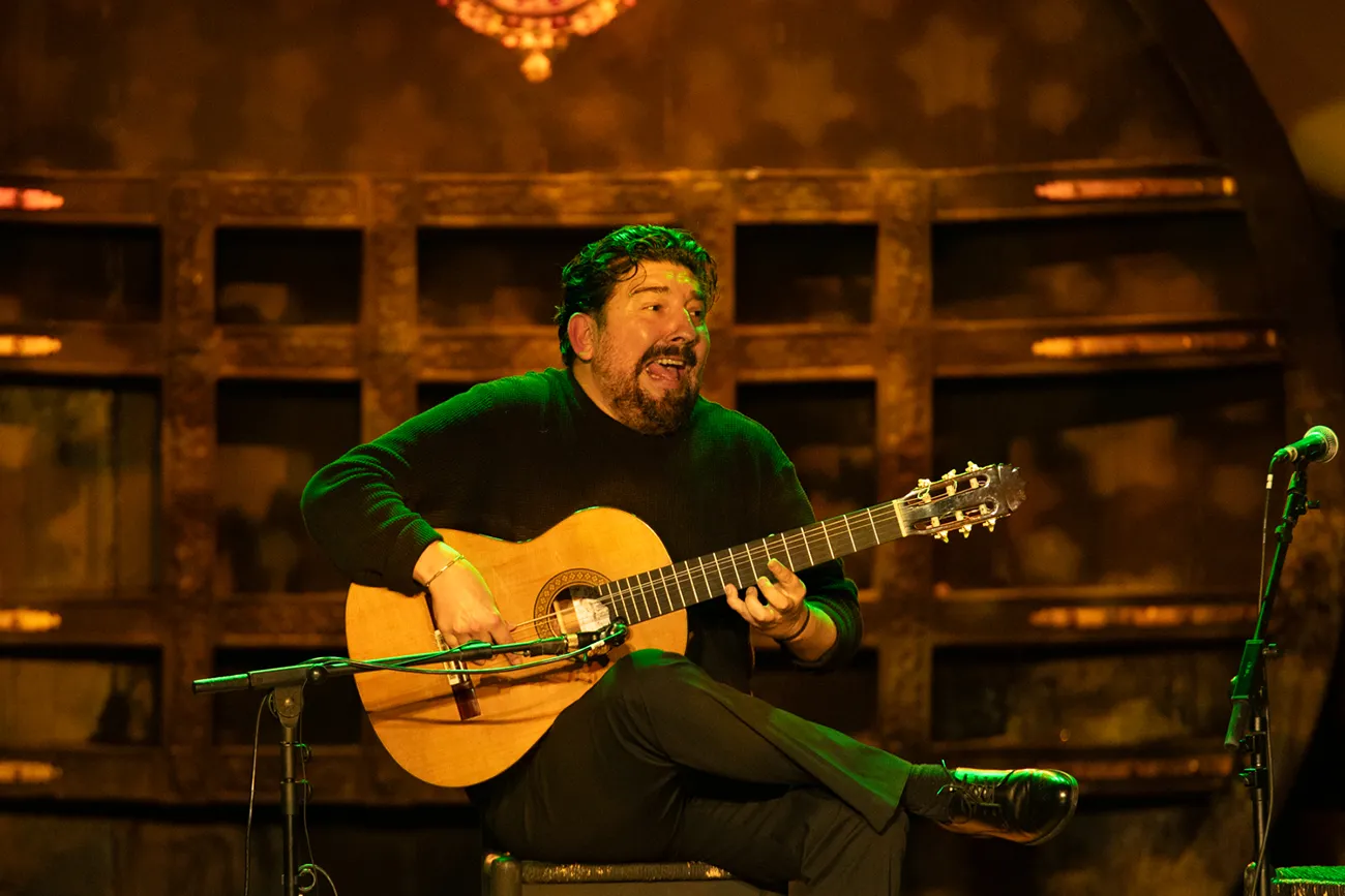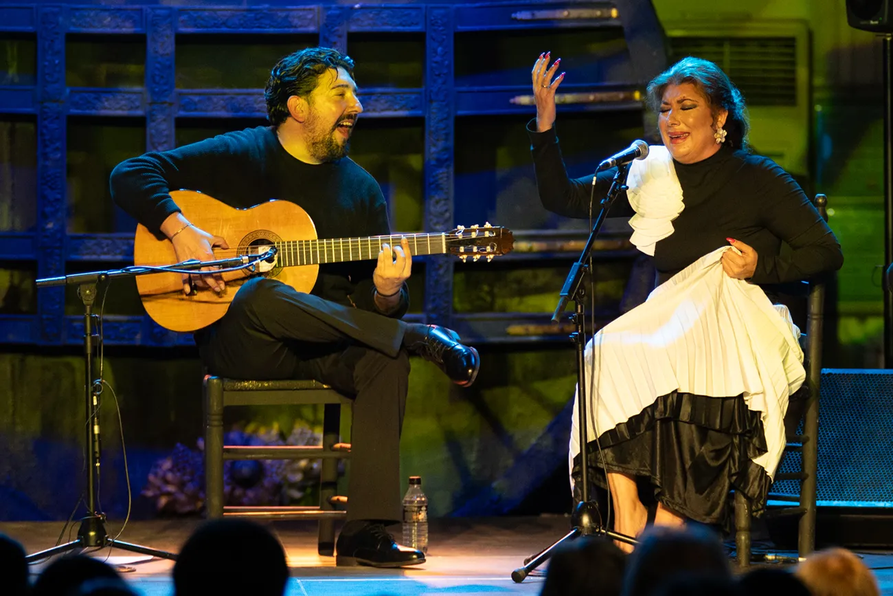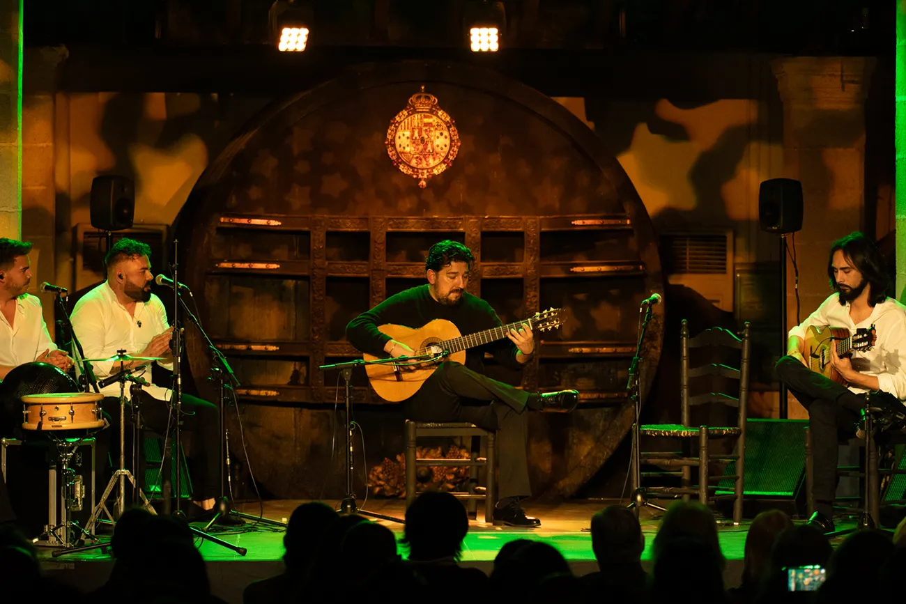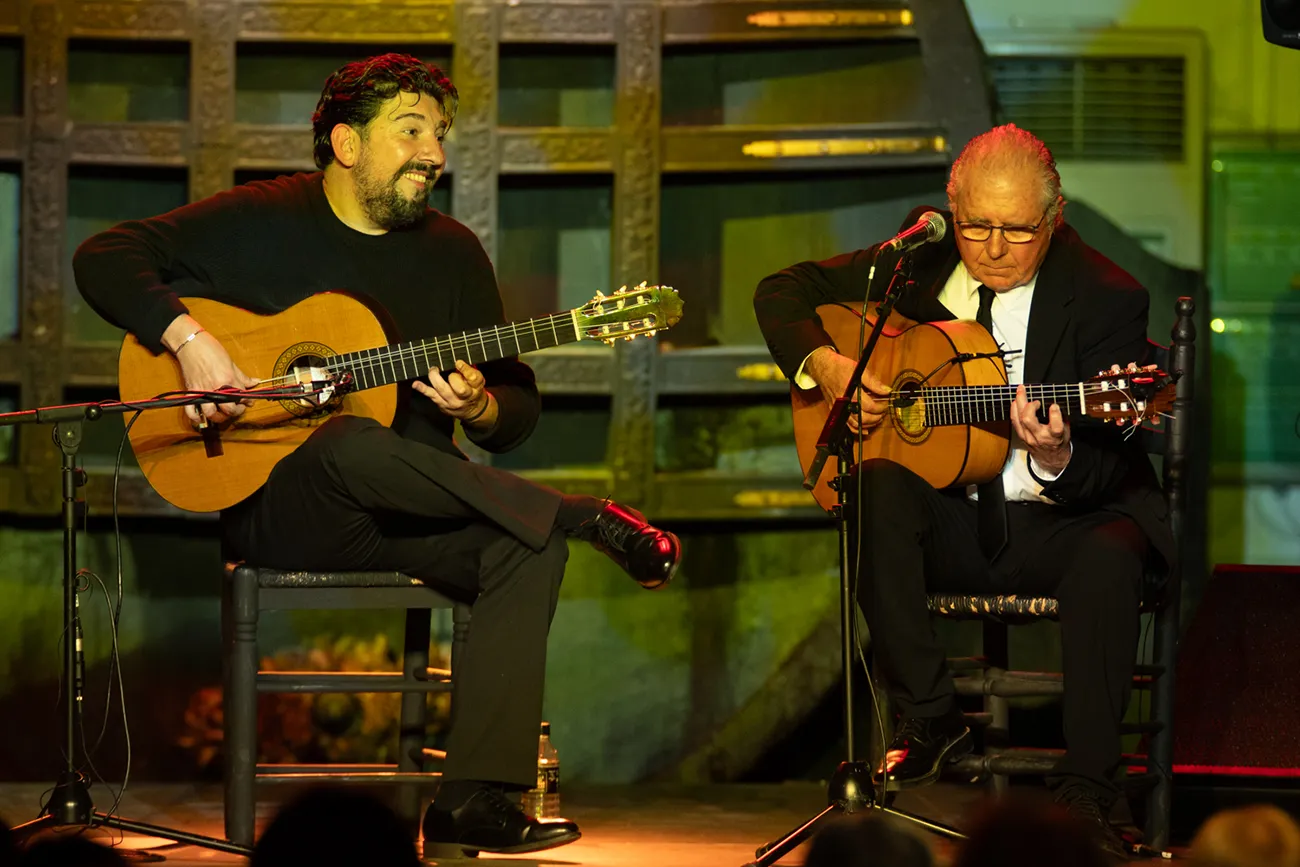 Las falsetas fluyen en el espacio bodeguero y la combinación de los sonidos en el tiempo nos lleva al camino andante de la Calle Cañaílla, unas alegrías que al espectador dan la impresión de regodearse en los matices, ofreciendo, a la vez, una sonoridad que resultó robusta, sobrada de cuerpo, para proseguir con Mi Rey, la rumba que dedica a su hijo Antonio, llena de sensibilidad con vértigo.