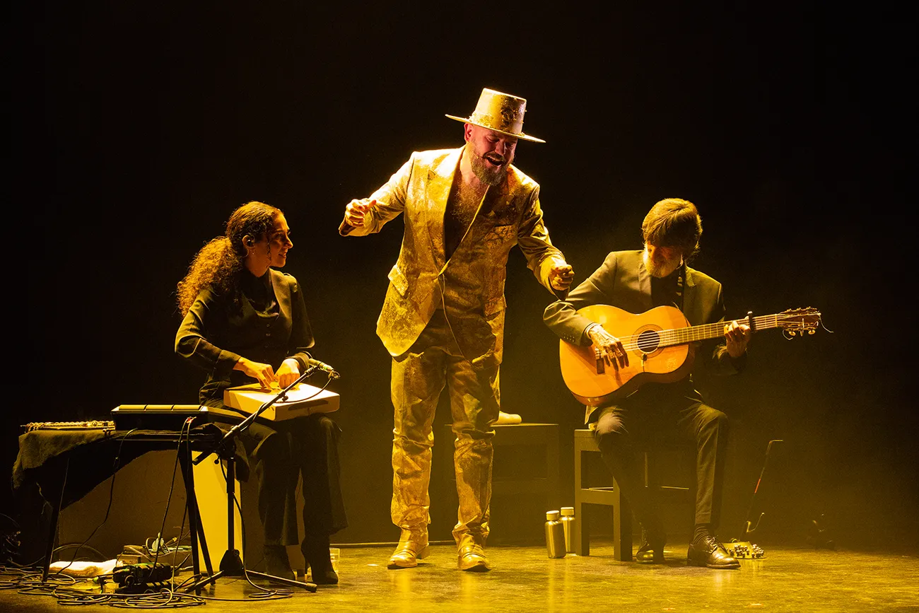 ¿No era eso lo que le reclamaban sus enemigos, que cante por derecho? ¿No era precisamente lo que jamás esperarían de un intérprete autodenominado exflamenco? ¿Que quiso levantar el acta de defunción de ese arte? Pues ahí lo tenemos, acompañado por la guitarra austera y leal de Emilio Caracafé y la percusión contenida y los efectos sonoros de Nessrine Rahmani, dispuesto a desgranar un repertorio casi-casi ortodoxo, sin apenas concesiones. Eso le obliga a adoptar, como cantaor, una humildad ante su oficio que no le exigían sus proyectos más excéntricos; y, curiosamente, le plantea el reto de estar al mismo tiempo dentro y fuera de la norma, como el gato de Schöeringer.
