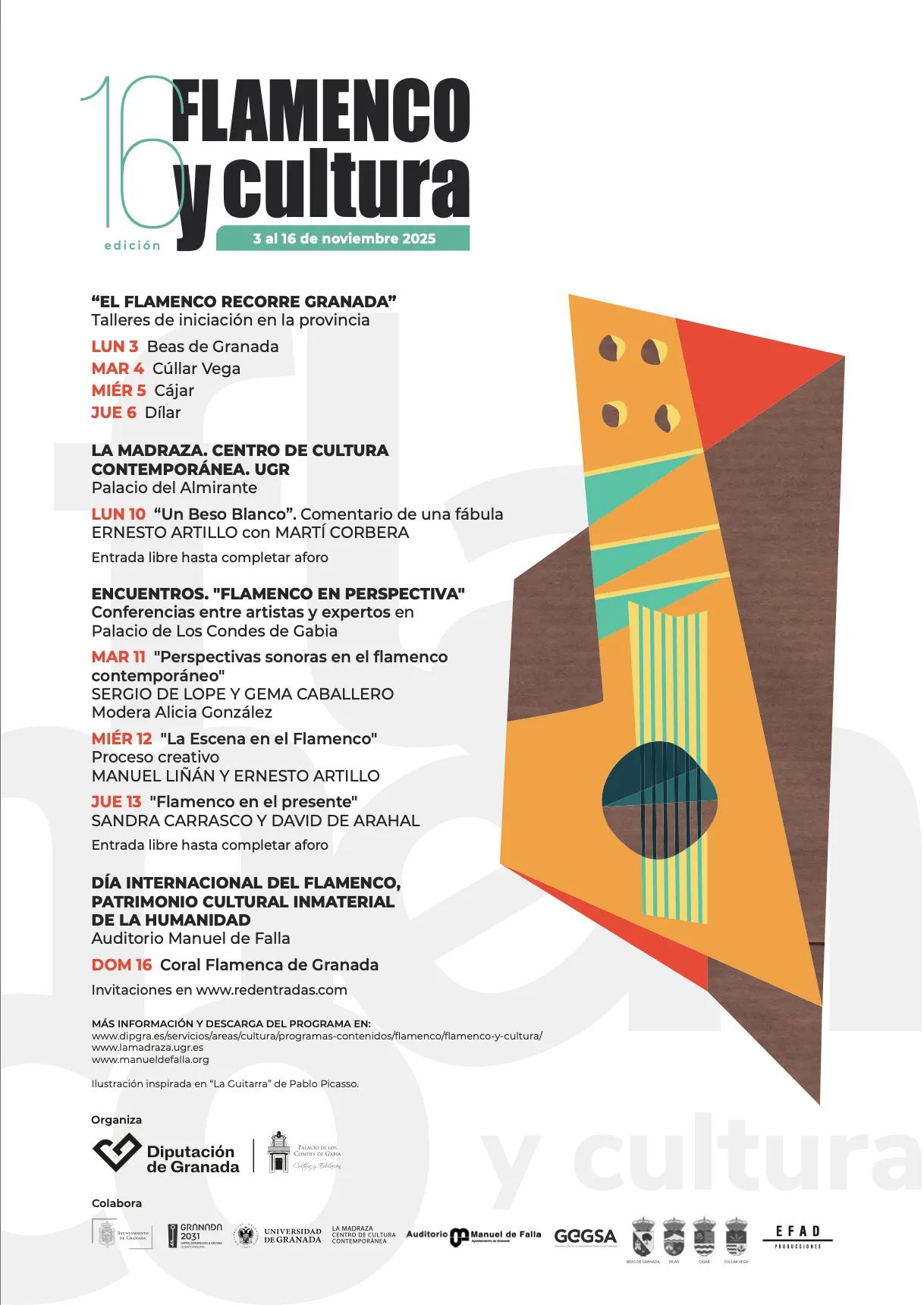 El programa arranca el 3 de noviembre con los talleres El flamenco recorre Granada, impartidos por el Grupo Efad, en Beas de Granada, Dílar, Cájar y Cúllar Vega, con la participación de Antonio Campos, José Fermín, Irene Morales, Andrea Anguera y Marta Bonilla. Estas sesiones acercarán al público la historia, el compás y la emoción del flamenco desde una perspectiva participativa.
