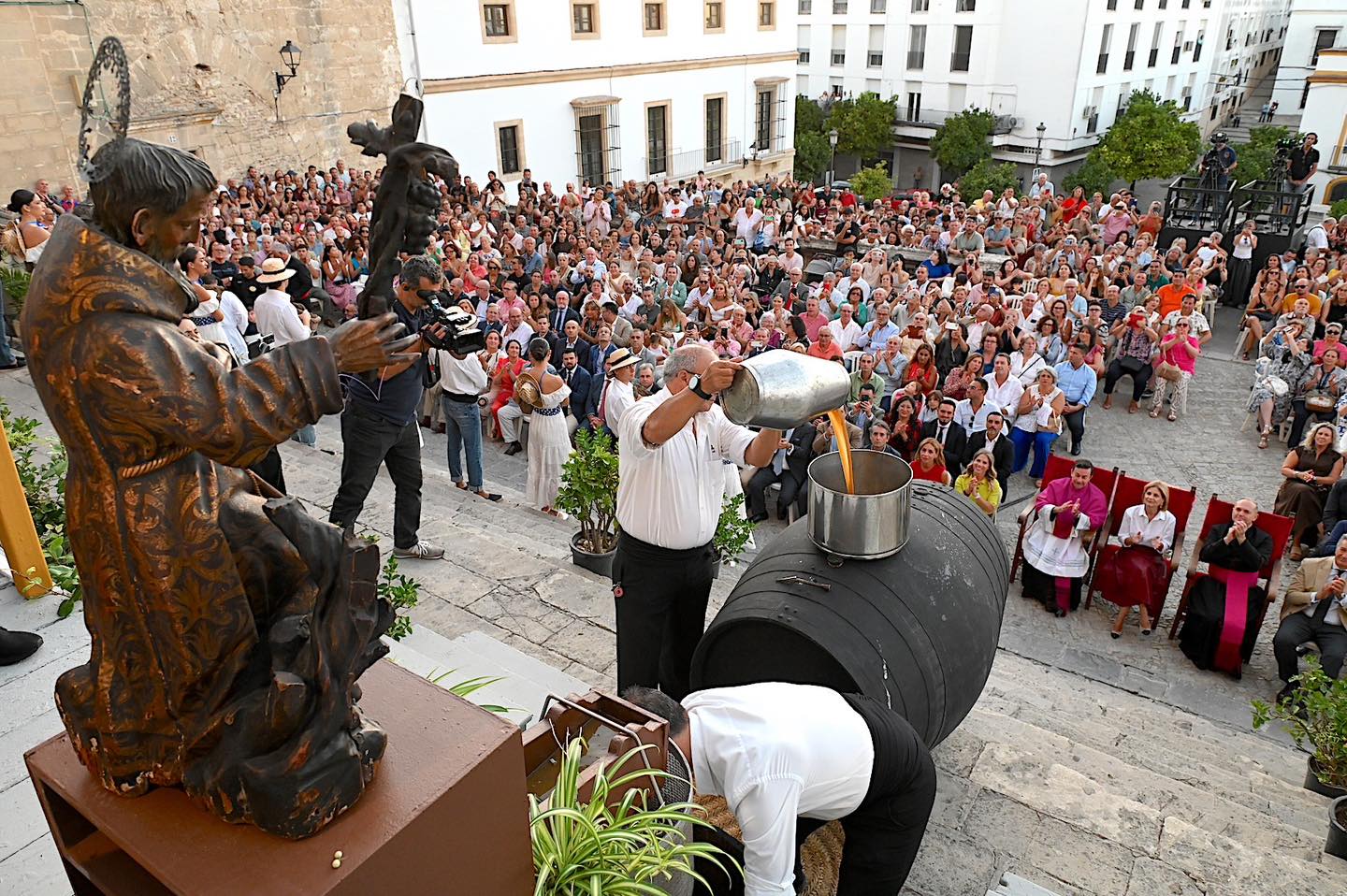 Este año, las firmas bodegueras González Byass y Fundador han aportado unos 1.200 kilos de uva para la ceremonia, para la recreación del inicio del proceso de producción del vino, que incluye su llegada al lagar, la tradicional faena de la pisa de los racimos y la extracción del primer mosto tras la vendimia.