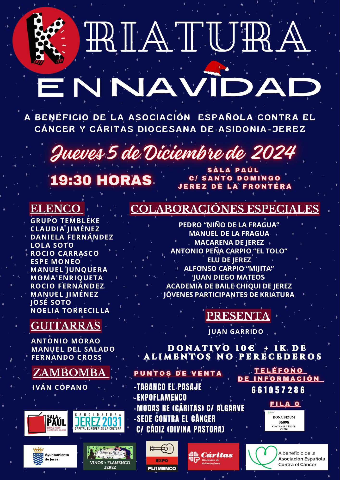 Hasta el momento, no se había realizado ninguna actividad concreta referida al mundo de la Nochebuena. Noelia B Torrecilla tuvo la idea de organizar una zambomba solidaria a beneficio de la Asociación de la Lucha contra el Cáncer y Cáritas que ha tenido todo el respaldo de Kirstine Hastrup, fundadora de Kriatura, y el cantaor Pedro de la Fragua. Tras la entrevista tenéis el cartel con la convocatoria completa que se celebrará el próximo día 5 de diciembre en La Sala Paúl de Jerez con un numeroso y extraordinario elenco de grupos y artistas.
