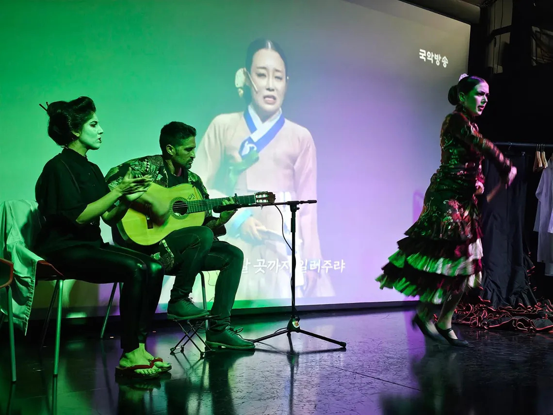 Y de Japón viajamos a Corea, pues Irene Núñez, bailaora y estudiosa de la cultura coreana a la que actualmente dedica su tesis, nos trae un número bellísimo que contrapone la guajira –su baile con abanico es un dechado de elegancia y feminidad– con la pansori, una canción tradicional coreana que normalmente ejecutaban artistas mujeres y que, como pudimos comprobar, guarda asombrosas similitudes con las cadencias de algunos cantes flamencos.