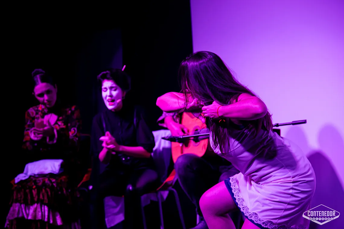 Mención aparte merece la música del montaje, perfectamente coordinada por Christian Nebermann a la guitarra, con el contrapunto del bajo flamenco de Conchi Mateo, ambos alumnos asimismo del Máster de Flamencología, interesado el primero en los códigos del baile de mujer, y en el teatro y la escenografía flamenca la segunda.