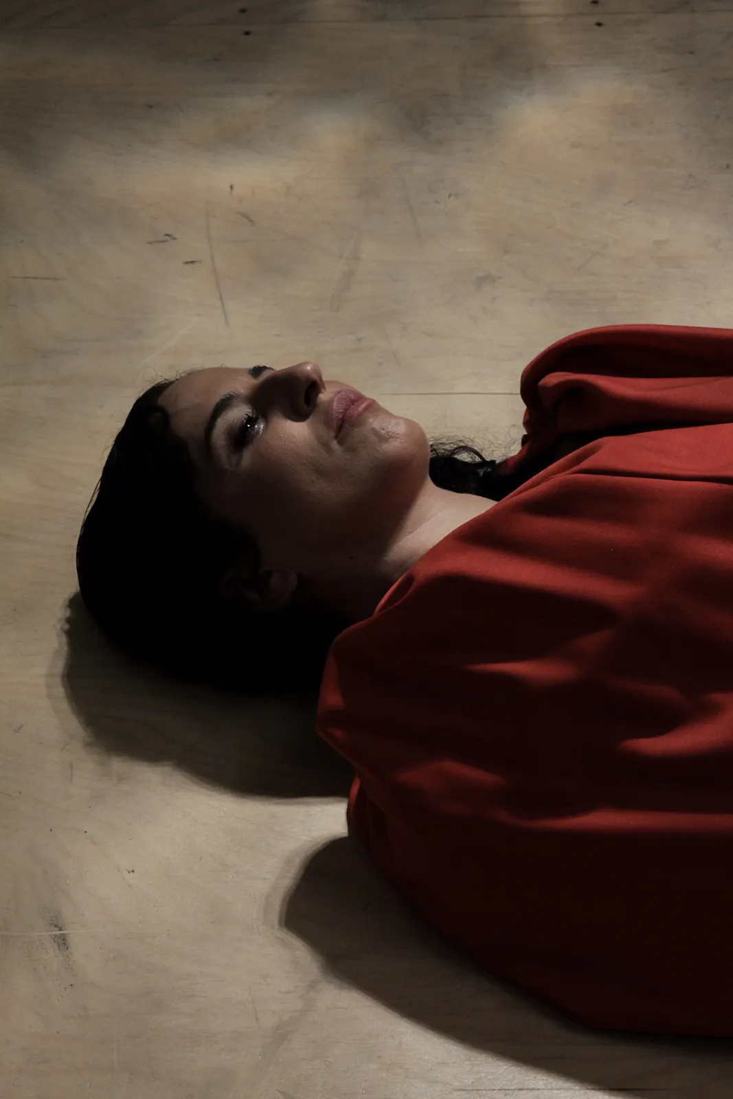 Como ella misma explica en su reflexión sobre la obra, quiere «bajarla a tierra y conversar con ella desde lo humano». Esta intención, noble y arriesgada, atraviesa toda la propuesta escénica, desde la escenografía aparentemente sencilla —una banda triangular de tela roja que cuelga del techo— hasta la polifonía vocal que protagonizan la cantaora Aroa Fernández y la soprano Paloma Espí.