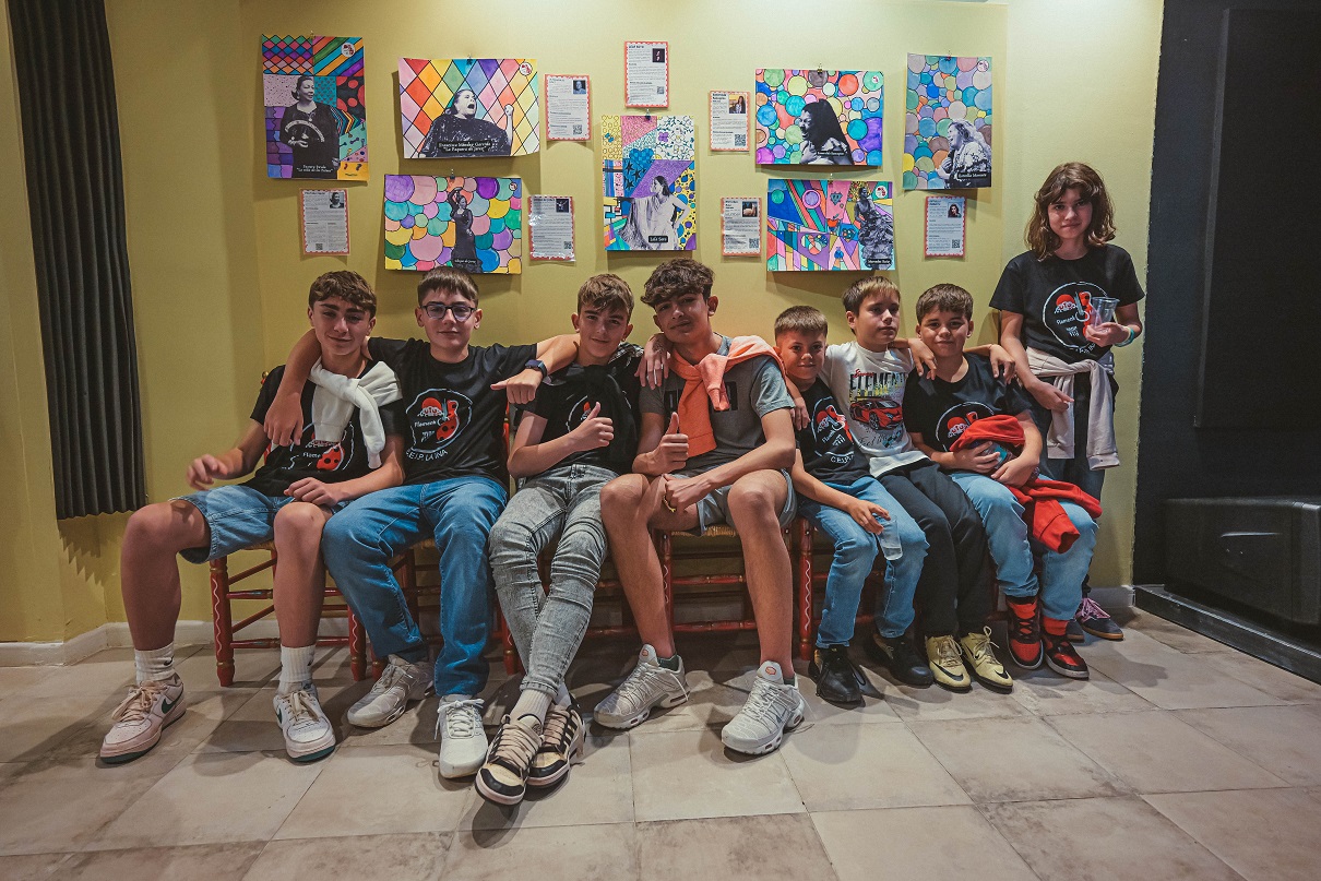 Un grupo de alumnos posa ante las láminas de varias artistas