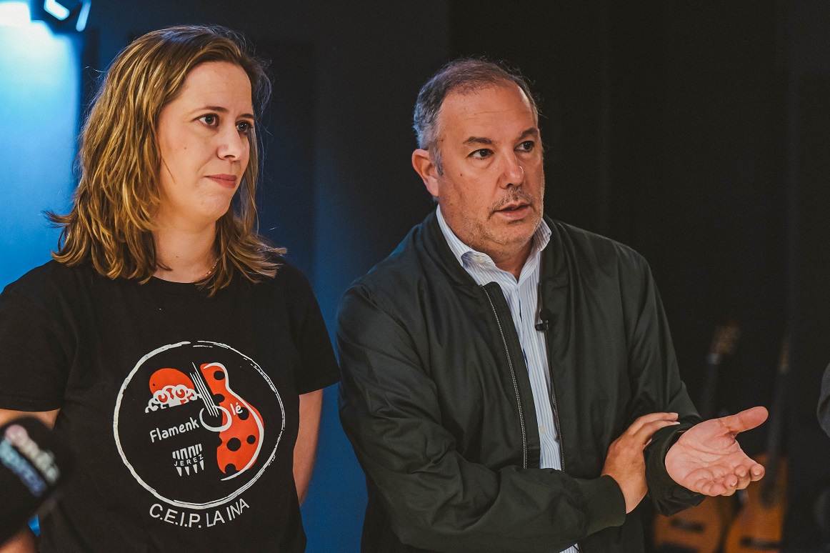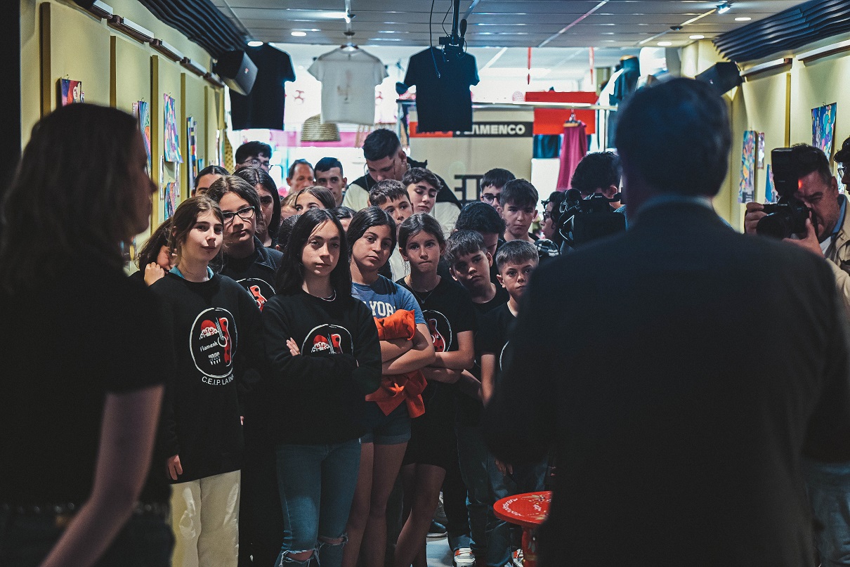 Los alumnos de los centros asociados a Flamenkolé y auores de la exposición atentos a las palabras del delegado