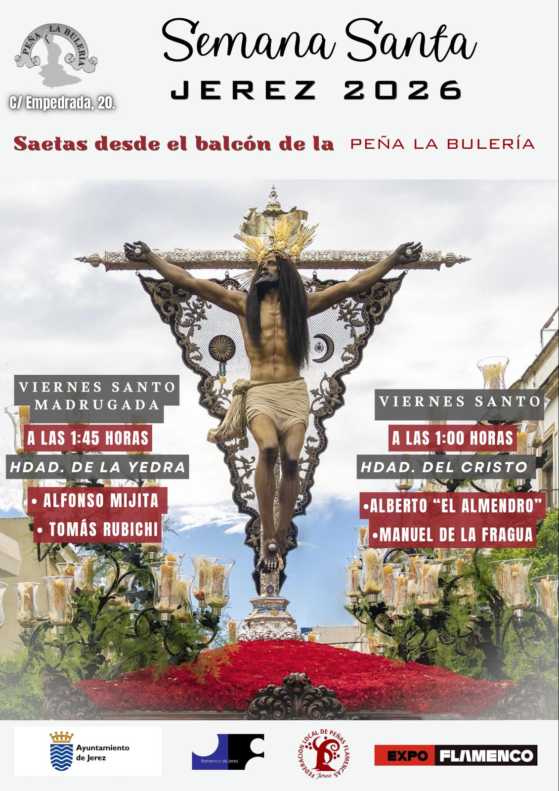 Añadir, por último, que la Peña La Bulería, además de estar incluida en el ciclo anterior con la representación de Alfonso Mijita, que cantará a la Hermandad de la Yedra en la Madrugada del Viernes Santo, junto a Tomás Rubichi, también ha informado que como cada año el balcón de la entidad de La Plazuela se abrirá para que suenen las saetas de El Almendro y Manuel de la Fragua a la Hermandad del Cristo de la Expiración. ♦