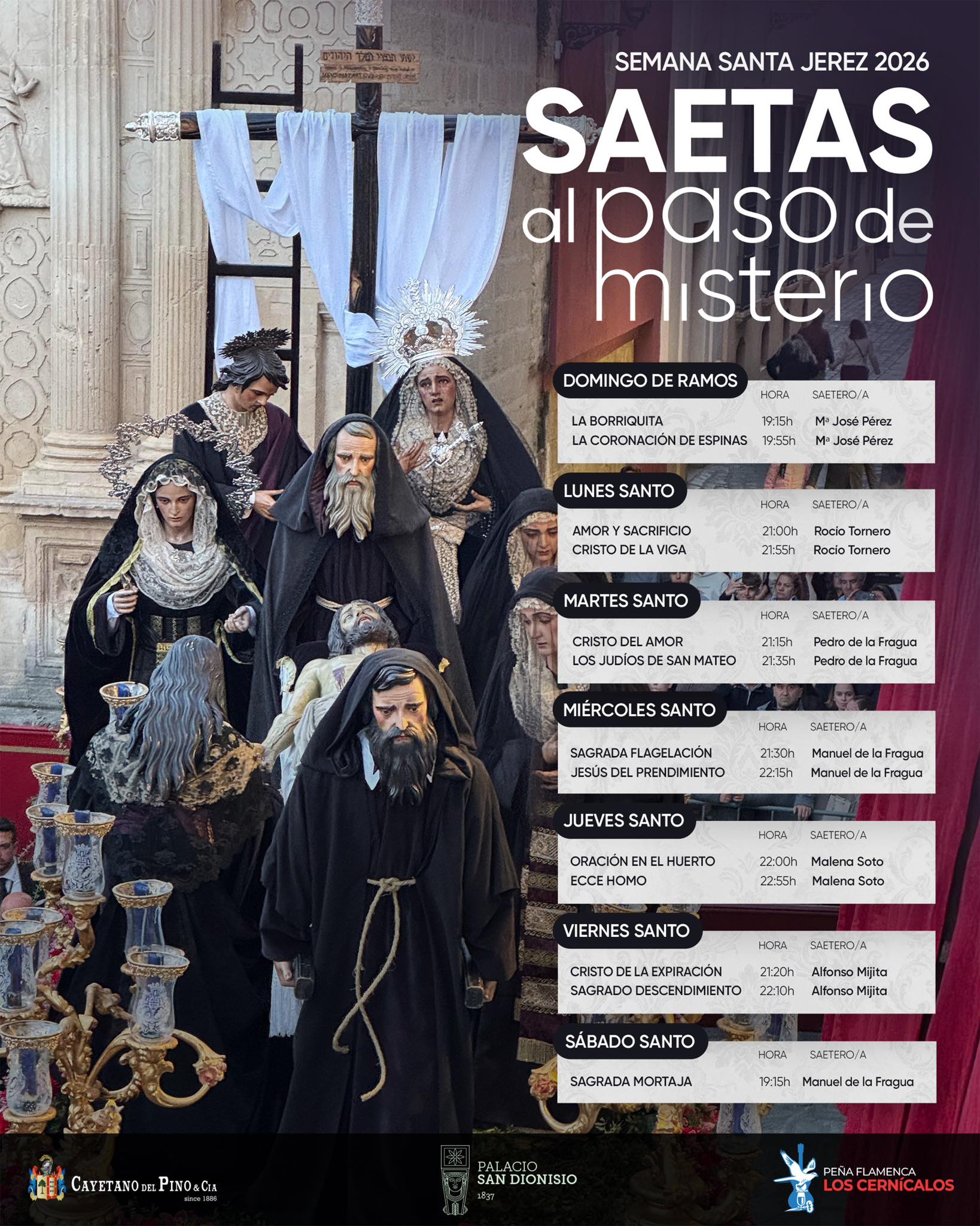 El Palacio de San Dionisio, junto a Cayetano del Pino y la Peña Los Cernícalos, presentó el ciclo Saeta al Paso de Misterio, desde el balcón del propio palacio en Plaza de la Asunción, plena presidencia de la Carrera Oficial. Nombres como María José Pérez, Rocío Tornero, Pedro Niño de la Fragua, Manuel de la Fragua, Malena Soto y Alfonso Mijita son los participantes. Cabe matizar que solo se le cantarán saetas a los pasos de misterio, esto es, santas imágenes cristíferas, por el tiempo de cofradía, para que no suponga un problema para los horarios oficiales.