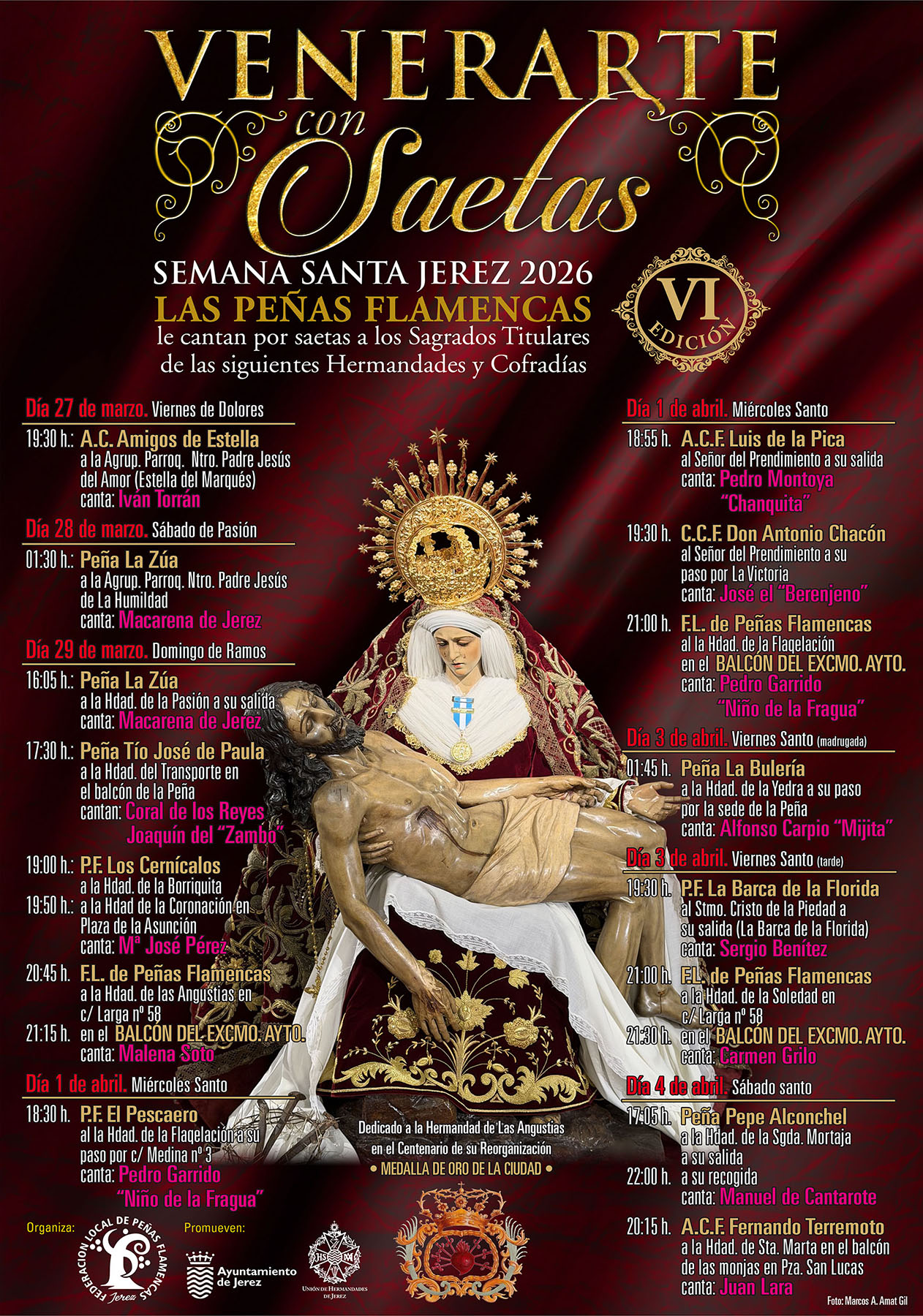Del mismo modo, las peñas flamencas con su Federación han dado a conocer los detalles del ciclo Venerarte con Saetas, que cumple seis ediciones, comenzando allá por pandemia. Desde el Viernes de Dolores se viene celebrando, llevando el rezo flamenco hasta las pedanías y entidades locales autónomas como Estella del Marqués, donde cantó Iván El Torrán, o la Barca de la Florida, con Sergio Benítez en la tarde del Viernes Santo. Participarán en distintas localizaciones, también a pie de calle, con Macarena de Jerez, Coral de los Reyes, Joaquín El Zambo, Malena Soto, Niño Fragua, Carmen Grilo, Manuel de Cantarote, Malena Soto, Alfonso Mijita, El Berenjeno, El Chanquita…, entre otros.