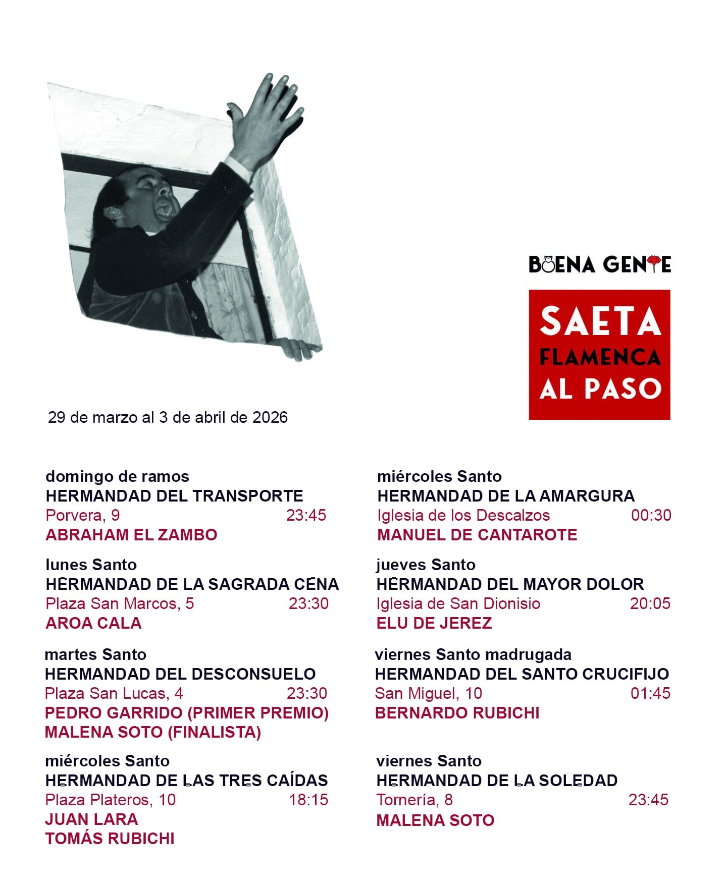 Por apuntar, el Primer Premio del Concurso Nacional de Saetas de la Peña Buena Gente en su 47ª edición ha ido a parar a Pedro Garrido ‘Niño de la Fragua’, valorado en diez mil euros, cifra récord e histórica en un certamen de este tipo. El Segundo Premio es para Juan de Mairena, mil trescientos euros, aunque la entidad ha informado de su renuncia al mismo, y el Premio Joven va para Manuel Junquera, con quinientos euros. Pedro y Malena Soto (por la renuncia de Juan), premiado y finalista, le cantarán saetas a la Hermandad de los Judíos de San Mateo en la noche del Martes Santo desde el balcón de la Plaza de San Lucas, colegio Salesianos, sobre las 23:30 horas. El resto de finalistas –Elu de Jerez, Tomás Rubichi, Juan Lara y otros nombres como Aroa Cala, Bernardo Rubichi, Abraham El Zambo o Manuel de Cantarote– harán lo propio a otras cofradías durante la semana dentro del ciclo Saeta Flamenca al Paso que organiza la peña.
