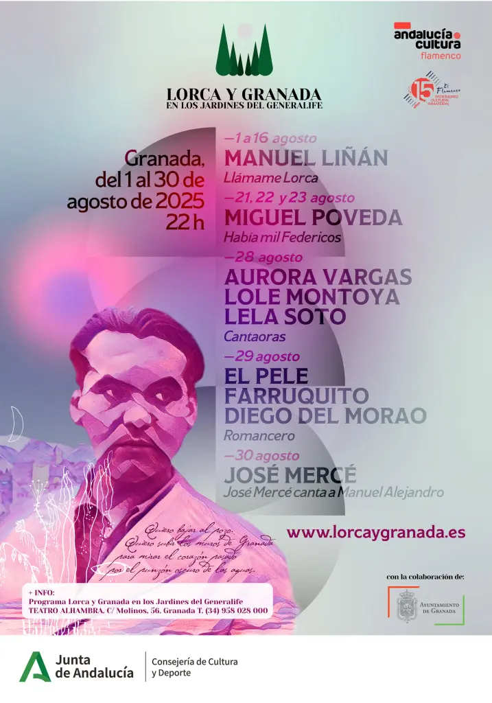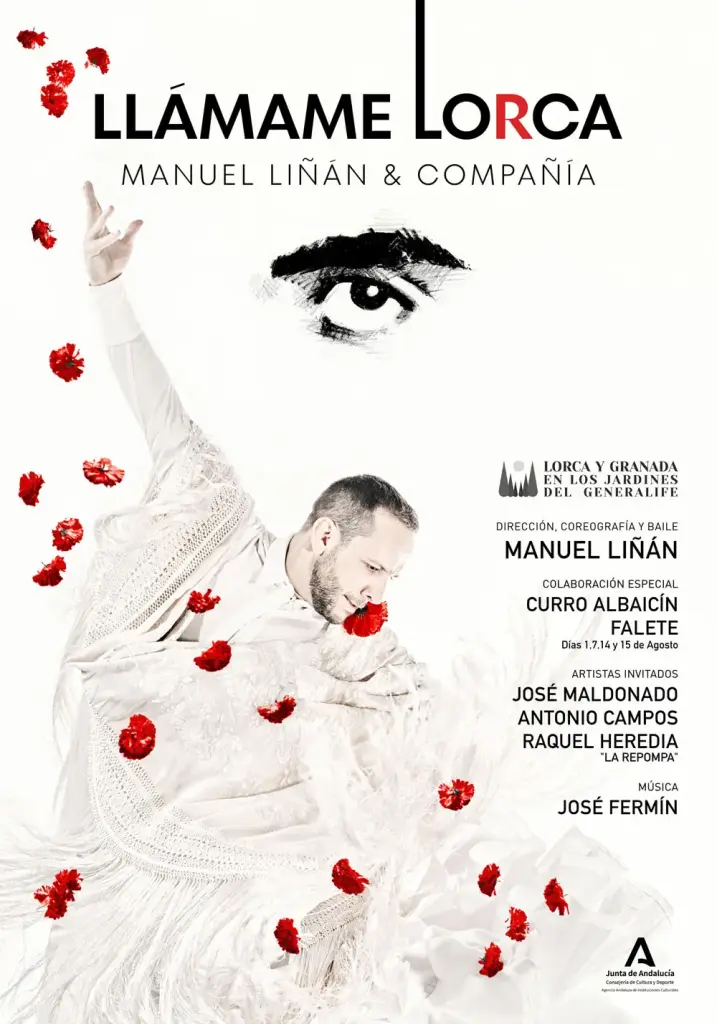 La XXIV edición del ciclo ‘Lorca y Granada en los Jardines del Generalife’ va a contar este año con la actuación principal del bailaor y coreógrafo Manuel Liñán, Premio Nacional de Danza, con su obra ‘Llámame Lorca’. Liñán pondrá en escena su particular versión flamenca del simbolismo lorquiano entre los días 1 al 16 de agosto. Por su parte, será otro Premio Nacional, esta vez de Música, Miguel Poveda, quien lleve al escenario de la Alhambra, entre el 21 al 23 de agosto, por la senda marcada por el escritor granadino con su espectáculo “Había mil Federicos”.