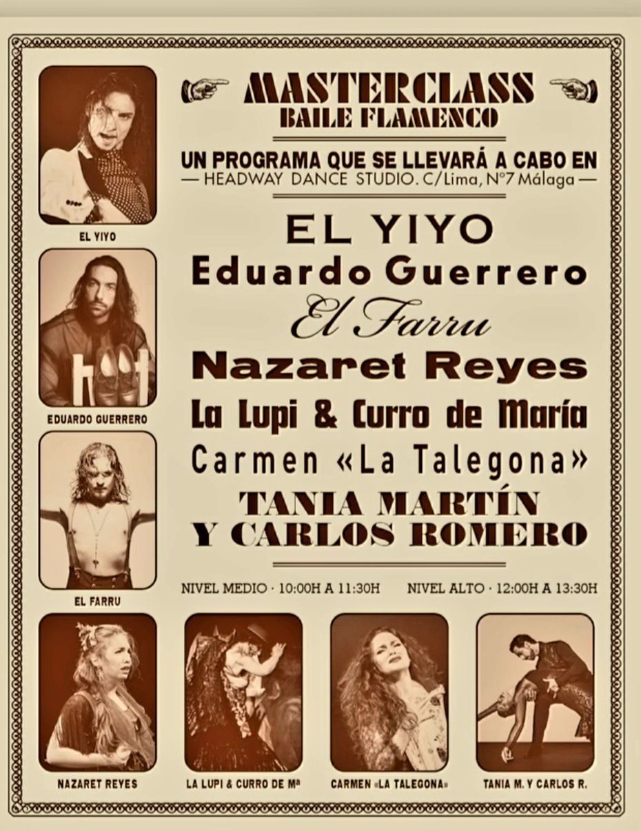 Listado y cartelería de formación de baile, cante y toque de flamenco en la provincia de Málaga.