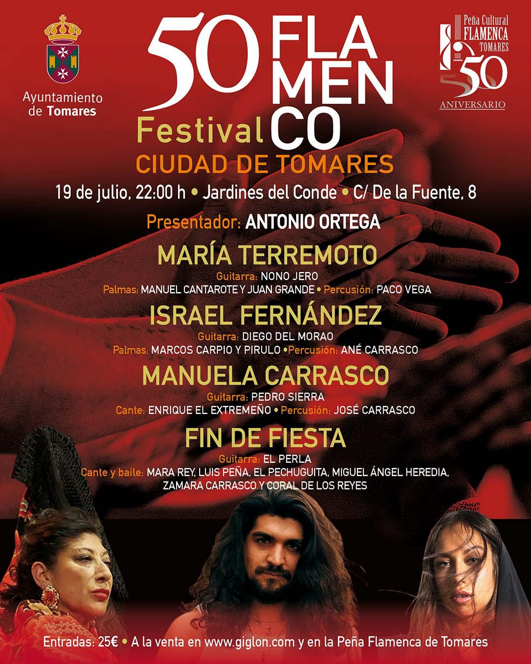El L Festival Flamenco de Tomares, organizado por la Peña Cultural Flamenca de Tomares en colaboración con el Ayuntamiento de Tomares, se celebra el sábado 19 de julio con Israel Fernández, María Terremoto y Manuela Carrasco.