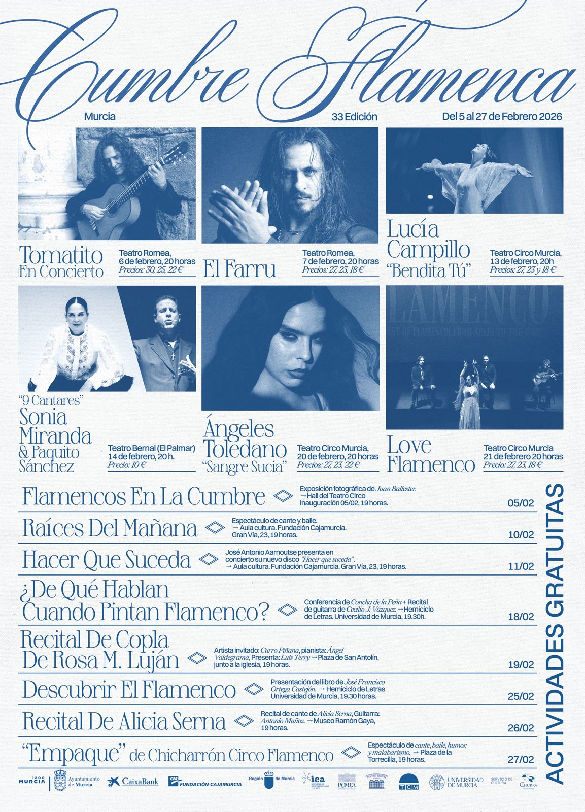 La Cumbre Flamenca de Murcia destaca, una edición más, por ser uno de los festivales flamencos con mayor número de actividades gratuitas, reafirmando su vocación de acercar el flamenco a todos los públicos y de convertir la ciudad en un gran escenario abierto durante el mes de febrero. Contará con seis espectáculos en ubicaciones tan emblemáticas como el Teatro Romea, el Teatro Circo o el Teatro Bernal, y ocho actividades paralelas como exposiciones, charlas o presentaciones de libros.