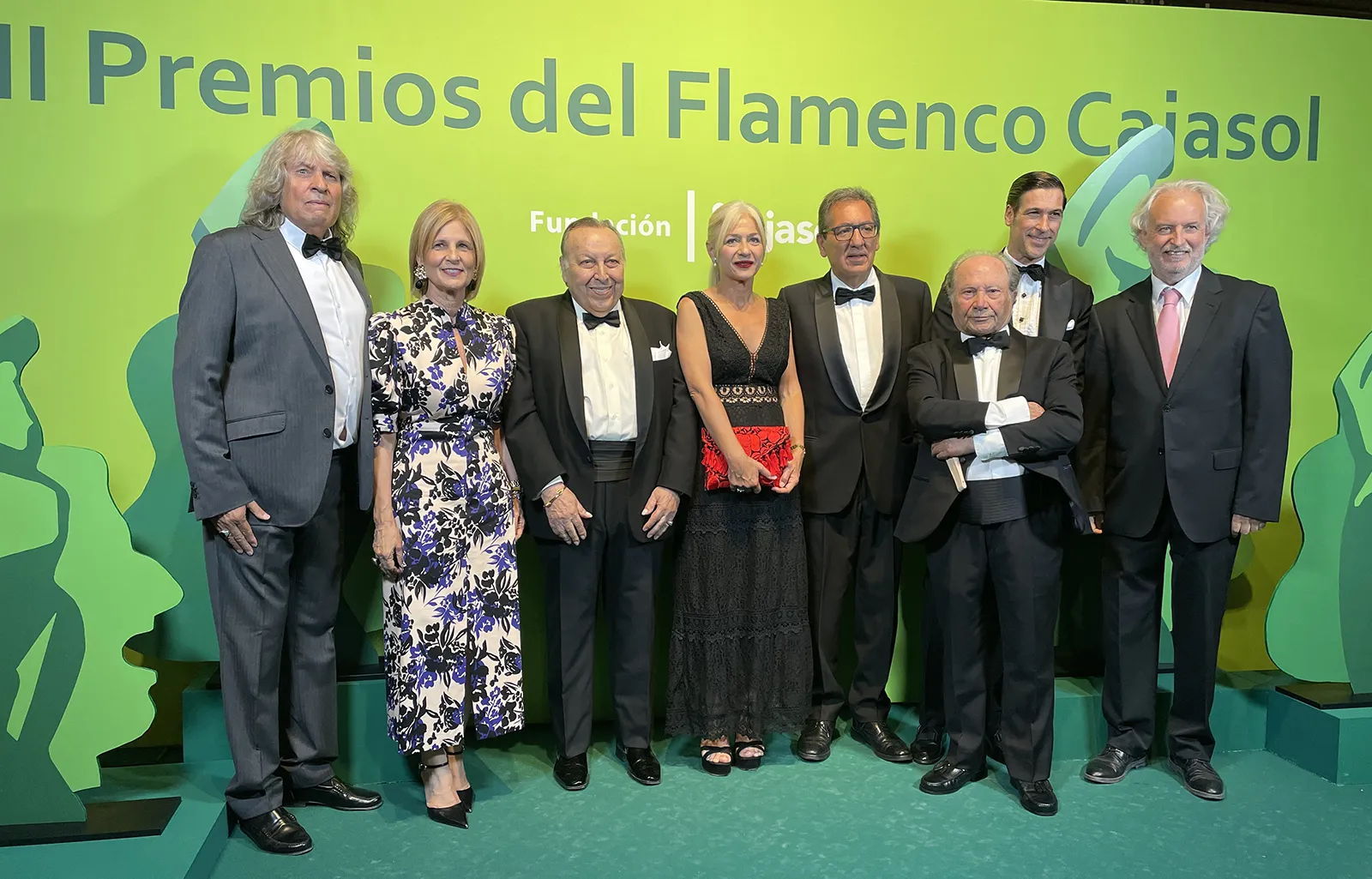 Esmoquin para ellos y traje largo para ellas. Es una de las características estéticas de esta Gala de los Premios del Flamenco Cajasol, en la que un nutrido número de artistas acompañan a los premiados de cada edición. Solo llevan dos años celebrándose y el objetivo de los organizadores, según el presidente de la Fundación Cajasol, Antonio Pulido, es que estos premios sean “la alfombra roja” para los artistas del flamenco. El lugar para la fiesta es la sede de la Plaza de San Francisco (Sevilla), pulmón cultural de la capital que acoge cada día actividades de todo tipo y, en determinadas noches, el arte nuestro se sube a las tablas con motivo de los Jueves Flamencos que en 2025 cumplieron veinticinco años de su nacimiento. Fue ese el motivo, el especial aniversario, para crear estos reconocimientos dedicados a personalidades que mantienen una impoluta trayectoria como ha ocurrido en esta ocasión con José Mercé, Paco Cepero y Manolo Marín.