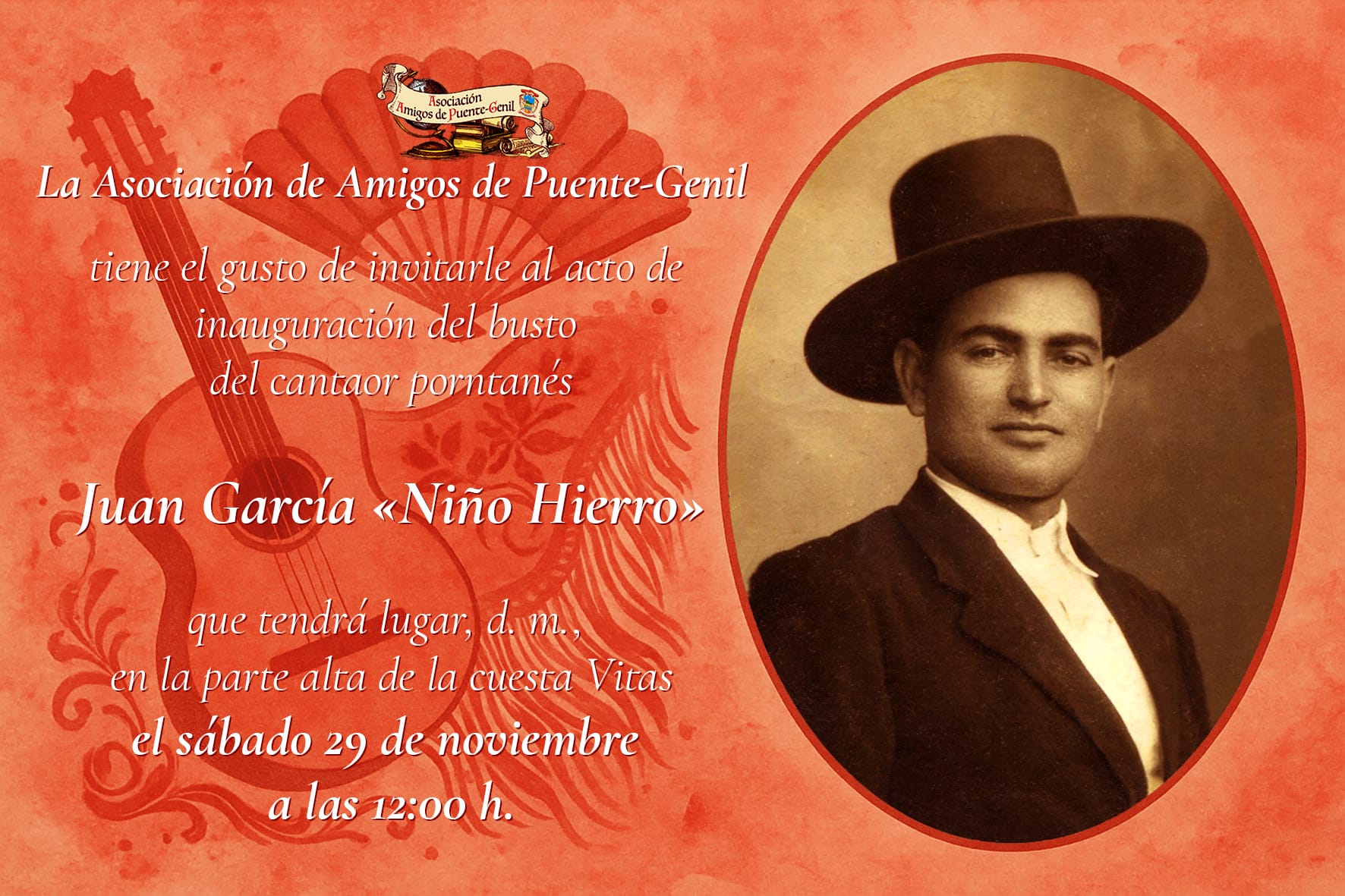 El sábado 29 de noviembre, a las 12 h en Puente-Genil (Córdoba), se inaugurará oficialmente un busto en memoria de Juan Hierro, una de las figuras más relevantes del flamenco pontanés. Tras Fosforito, Juan Hierro es considerado el cantaor más influyente nacido en la localidad, especialmente recordado por su personalidad artística y su aportación al patrimonio musical pontanés.