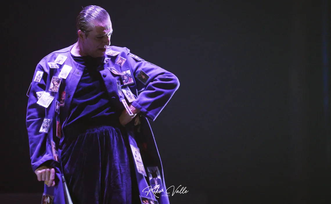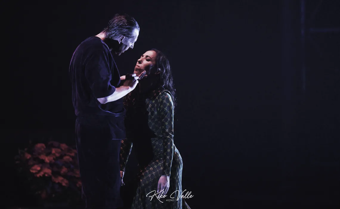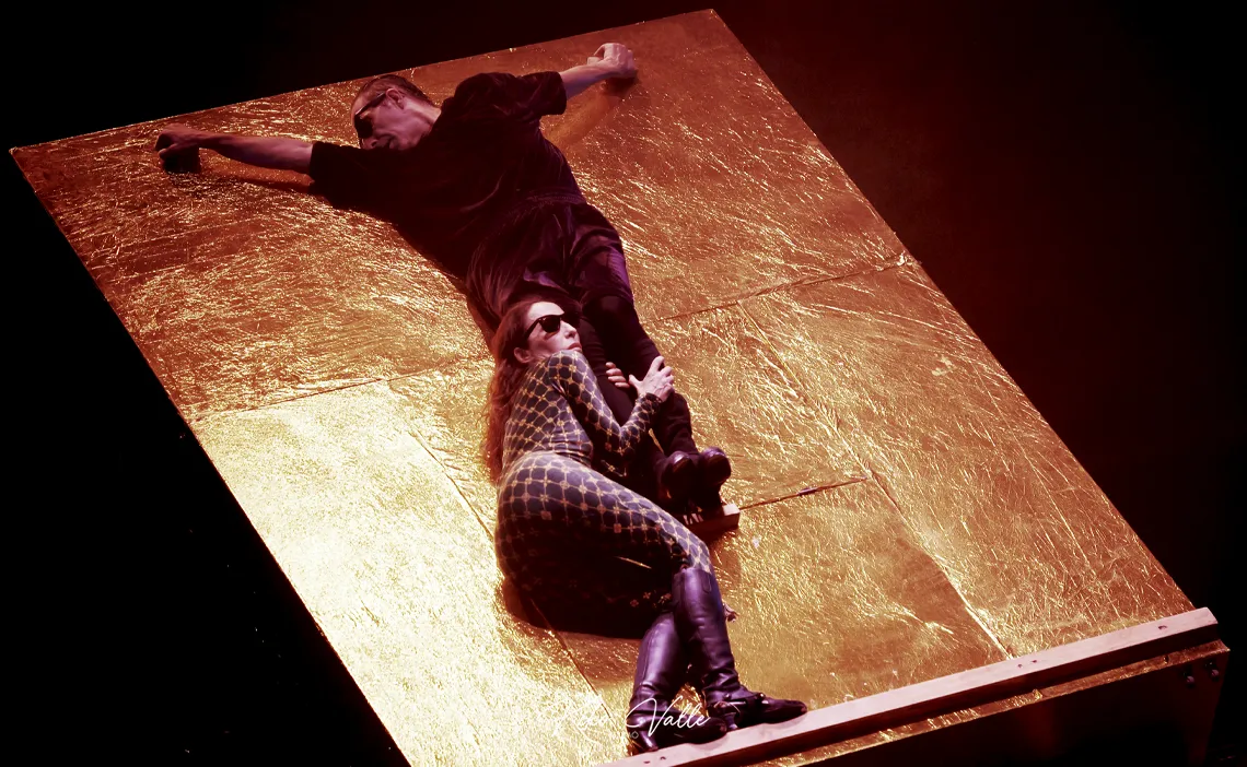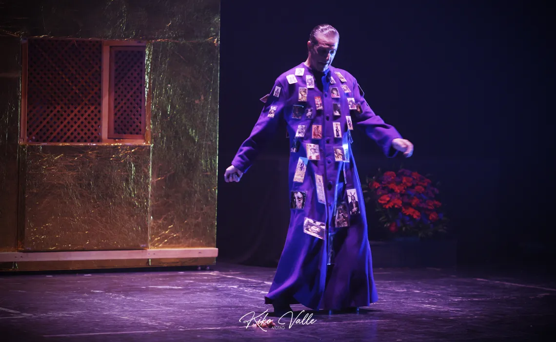 A la izquierda, una especie de órgano eclesiástico simulado con flores de cera colgantes y una mesa para el matarife. La percusión detrás. En el centro un confesionario que luego se transforma en plataforma de crucifixión y flores a cada lado. Andrés Marín que inicia la obra por delante del escenario, preparándose para el sacrificio, con el torso desnudo y bailando a su manera. Una Ana Morales con largas trenzas, con vestuario ceñido, en mallas. Armaos de La Macarena con sus cascos emplumaos tocando las cornetas, incienso en el proscenio… Cambios de indumentaria asemejándose a los ropajes de una Virgen y Jesús Nazareno. Ella de blanco y con volantes y él con túnica morada recubierta de estampitas plastificadas de imágenes de Cristo, con la que bailó por romances, al compás de bulería por soleá. Anteriormente ya sonaron los metales fundíos en el gañote de Campos o la soleá en la nuez de Marín, tendido en el suelo. Ana recibió varias obleas de la hostia consagrada como la que ansía su dosis de lujuría y placer, unas veces subida en el altar de una silla, otras pegada al cuerpo de Andrés. Bailan por sevillanas en un juego de seducción. Ana también por tientos… y mil detalles más que conformaron esta obra dantesca, por las claras alusiones a La Divina Comedia, en la que destilan los tintes antiguos para lanzarlos reformulados a la contemporaneidad.