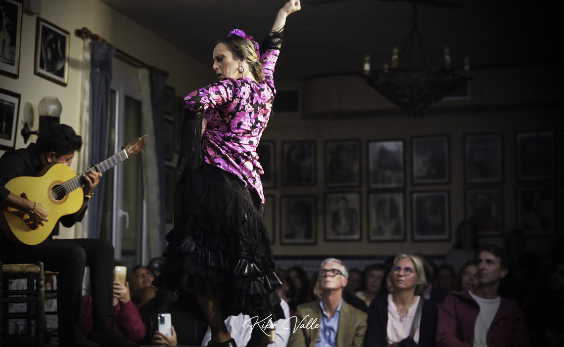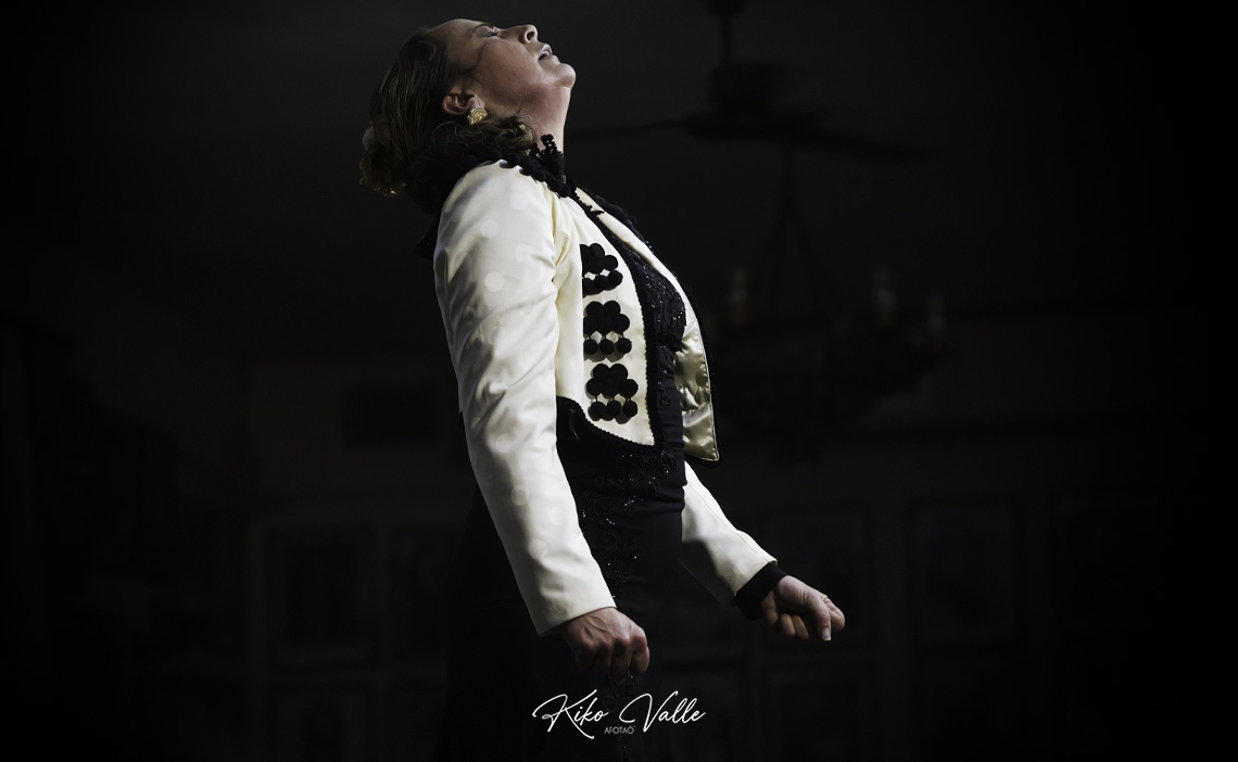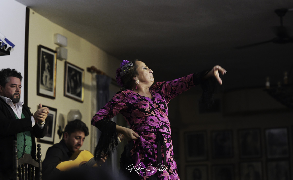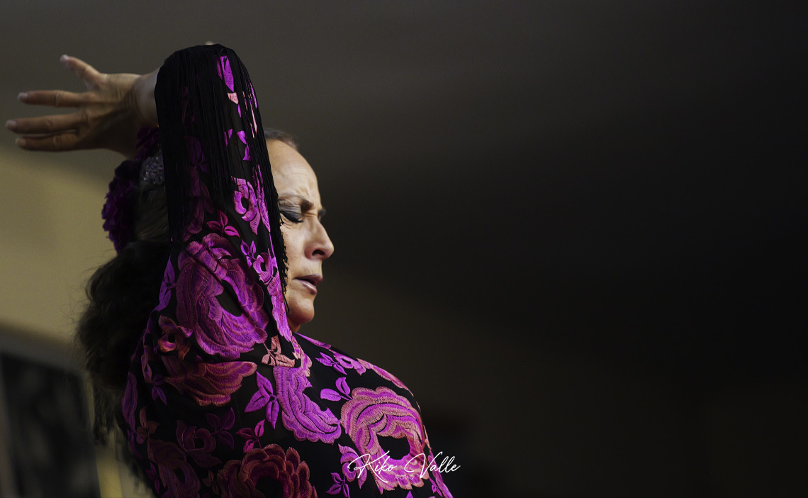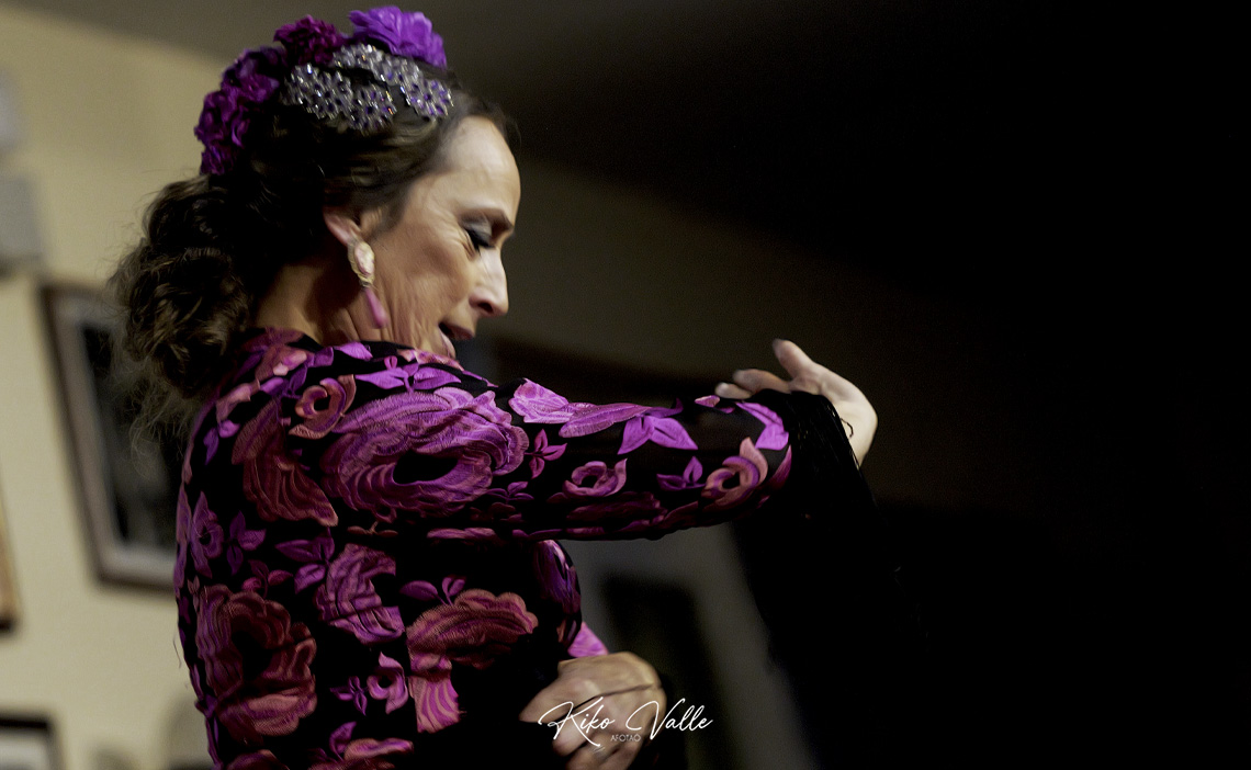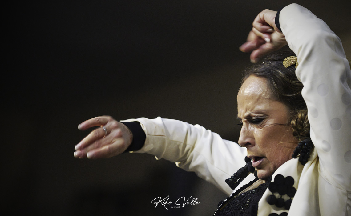 Por seguiriya se rebuscó en las caderas recias el dolor que la atravesaba, poderosa e hiriente, reflejándolo en su cara. Espontánea y segura, fuerte en las embestidas pero sabiendo pasear y brillar en los silencios paraos, colocaba los pies en su sitio y esbozó un braceo flamenquísimo. En la soleá por bulería, más redonda y picarona, meneó su cintura y el culo con age, recogiéndose con empaque el vestío. Llamadas y escobillas clásicas, zapateaos de trapío… Carmen Lozano le bailó más que bien al cante de su marido, a la guitarra de Ñoño y a las palmas de Fali del Eléctrico y de sus hijos Juan Carlos y Rafael Usero, conformando la comunión del arte en la Peña Flamenca Torres Macarena.