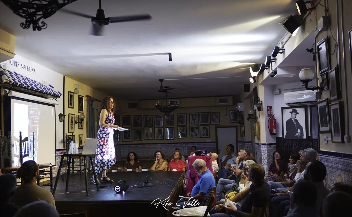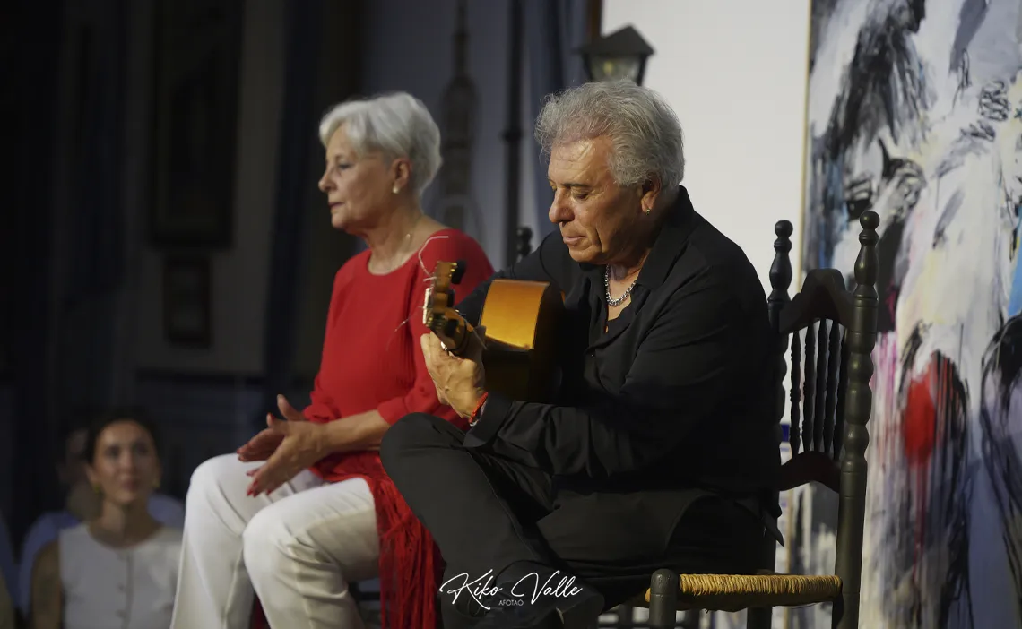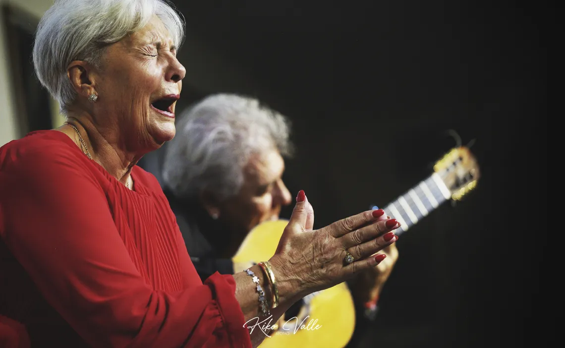 Afirmó con rotundidad que estaba rifá entre los compañeros y que no se sintió mal por ser en muchas ocasiones la única artista de los carteles, pretendiendo siempre dignificar el papel de la mujer en este género, como pudimos comprobar en un surtido de grabaciones sonoras –por granaínas, alegrías, soleá por bulerías o seguiriyas– y audiovisuales a las que fue dando entrada Ángeles Cruzado antes de que Tina nos deleitara con un recital de pequeño formato en el que se templó por malagueñas y abandolaos, soleá y bulerías –aquí levantó al público con la Maja Aristocrática de Pastora–, al arrullo de la bajañí infalible de Antonio Carrión.