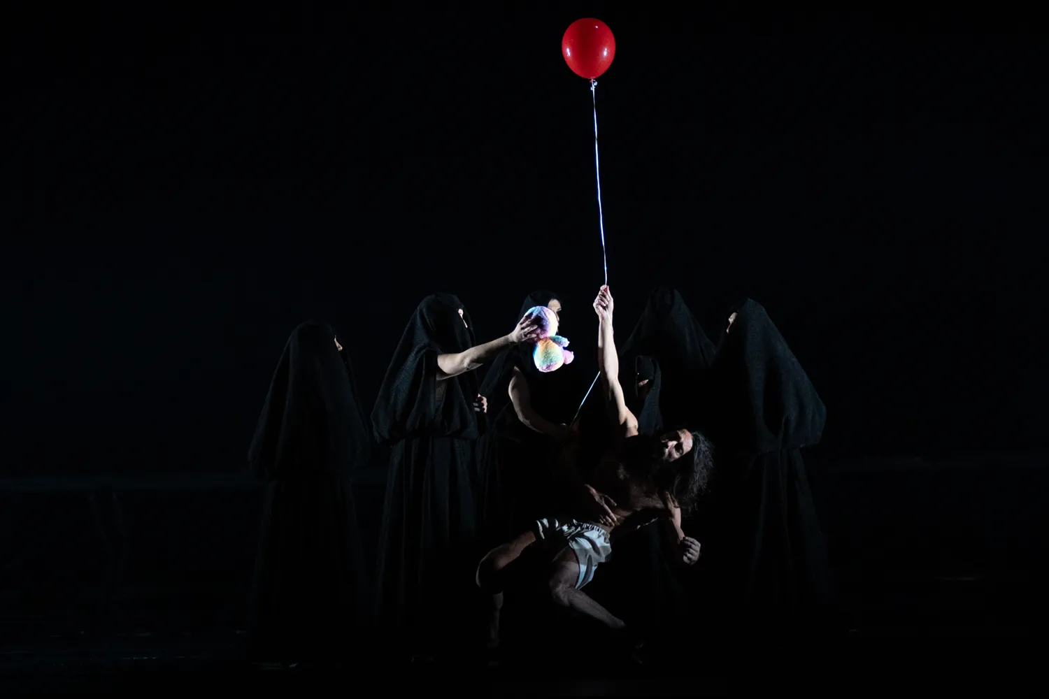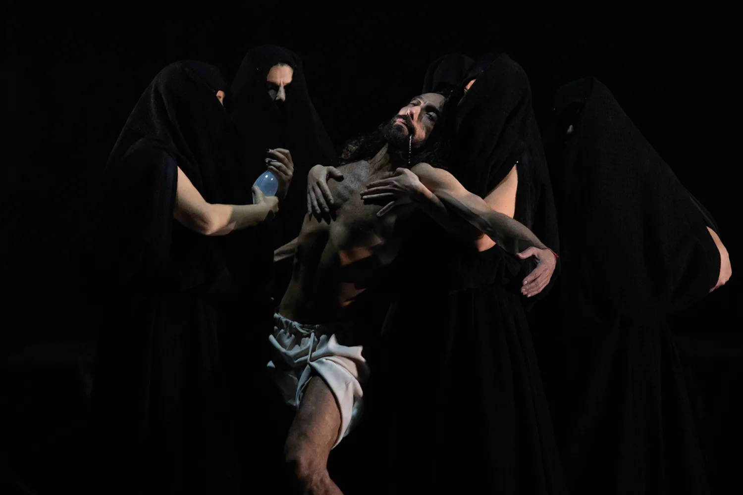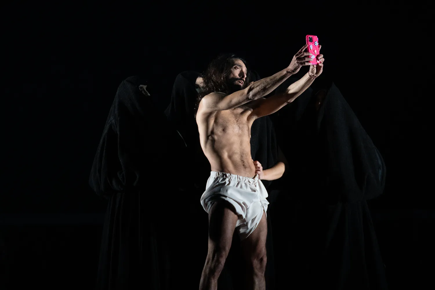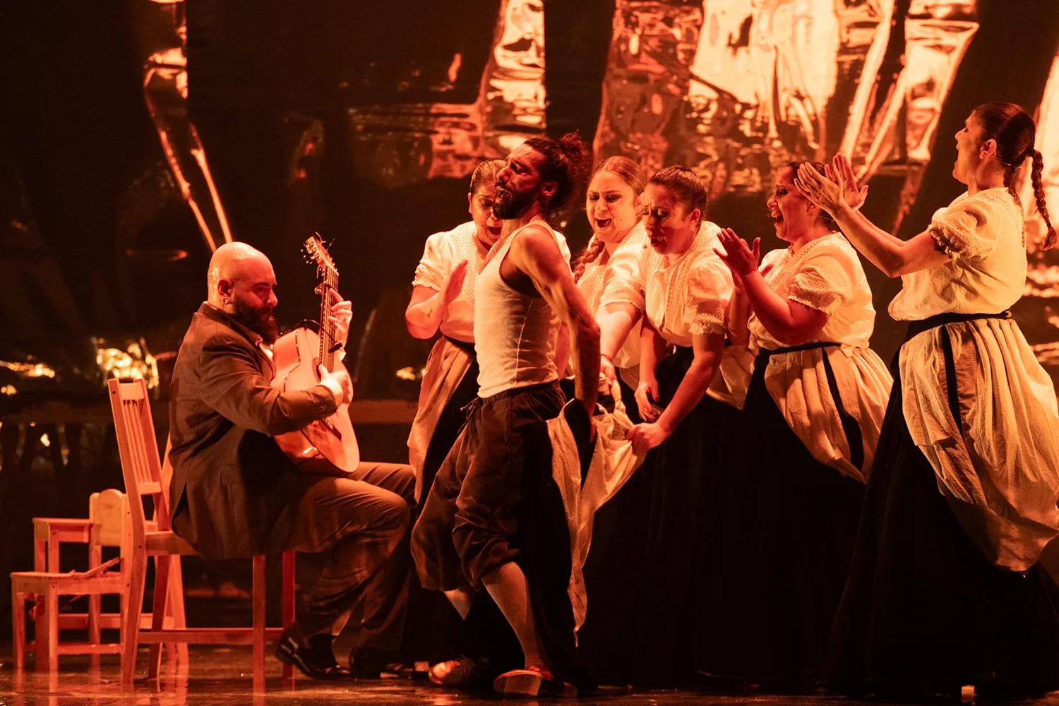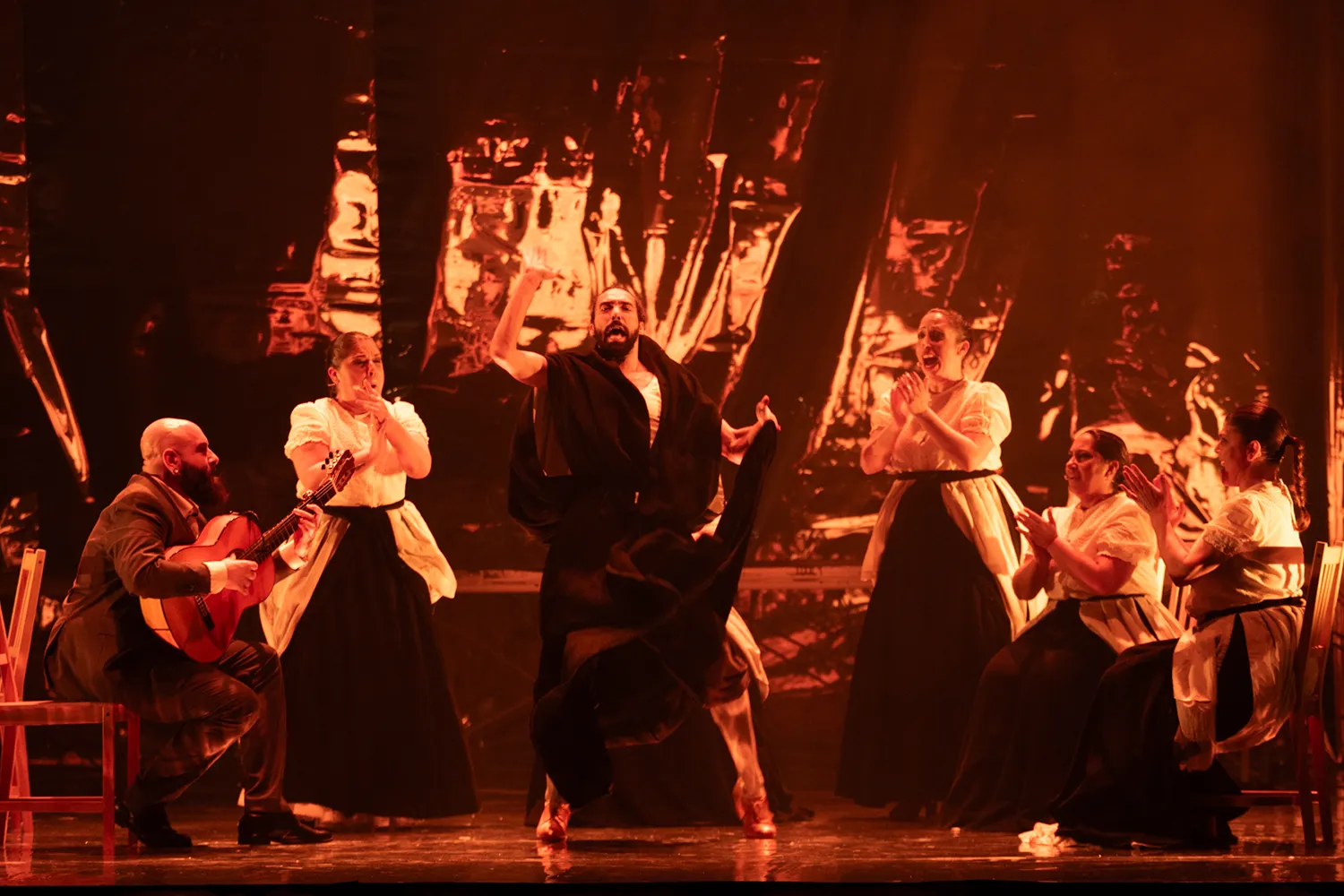 Guerrero, forzando un poco la realidad histórica, esgrime en el texto del programa esa prenda como símbolo de libertad y de resistencia. Sin embargo, el fantástico paseíllo que hace sostenido por estas mujeres, desgreñado y exánime como un cristo barroco, es puro surrealismo del que lo mismo brota un globo de helio que un teléfono con el que hacerse un selfie. No menos surrealista resulta la siguiente escena, en la que una de esas cobijás apunta al bailaor con un arma y lo hace bailar sobre una silla… para terminar alcanzando al guitarrista Pino Losada.