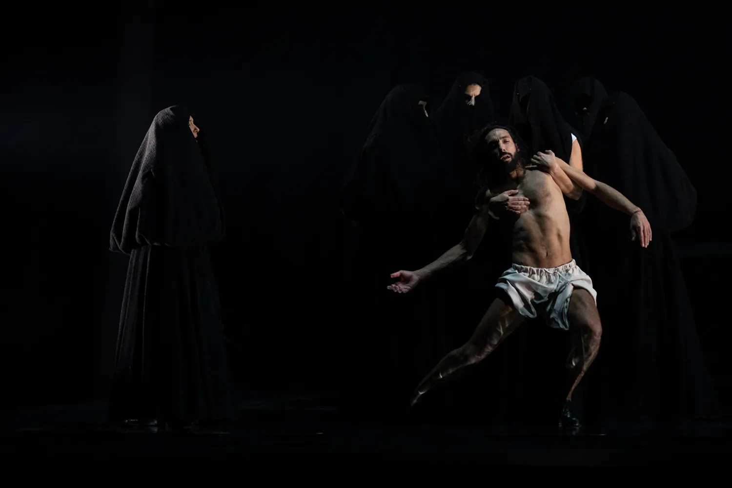 El bailaor gaditano comienza practicando, sobre un escenario desnudo, movimientos y contorsiones propias de quien quiere tomar el control de su cuerpo y no puede hacerlo, como tan a menudo sucede en los sueños. Acto seguido, comparece en escena un grupo de mujeres fantasmales, vestidas a guisa de cobijás de Vejer, con esa indumentaria de origen castellano de manto y saya oscuros que dejan ver tan solo un ojo.