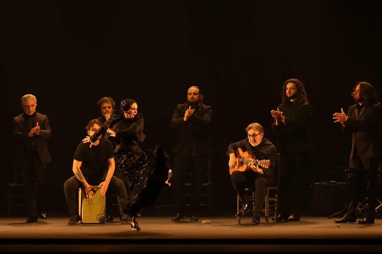 Con la seguiriya que le sucedió quedó patente que el cante no iba a ser un mero acompañamiento este anoche. Cuatro voces impecables como las de Miguel Ortega, Segundo Falcón, Ezequiel Montoya y Antonio El Turry le disputaron el protagonismo al baile turnándose bajo los juegos de luces cenitales, sin olvidar el confortante faro de Paco Jarana, que también tuvo su momento de lucimiento en primera fila, pero cuyas seis cuerdas sustentaron en todo momento el edificio del espectáculo. Completaban el elenco una sólida base rítmica en manos de Daniel Suárez, y el baile del Oruco, que dio un descanso a la granadina.
