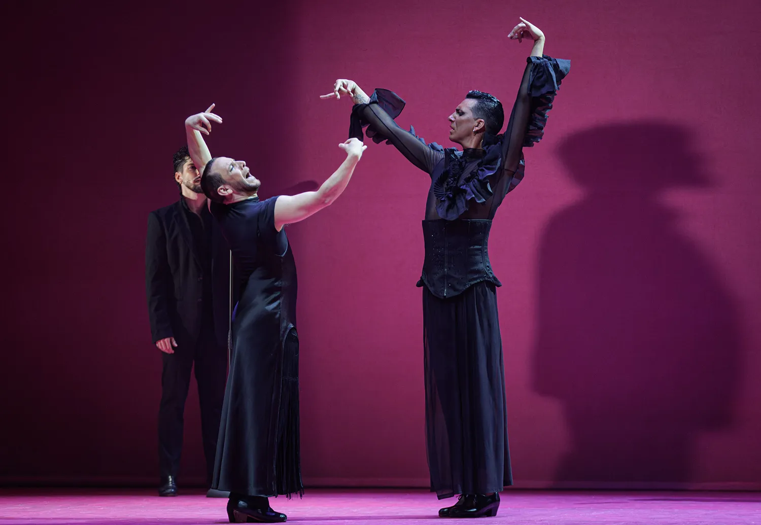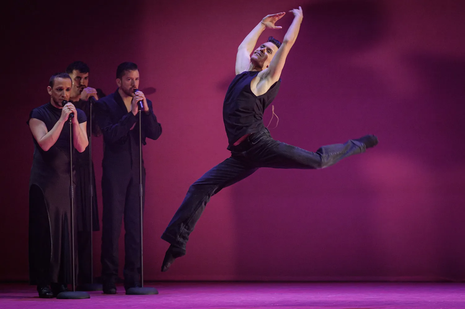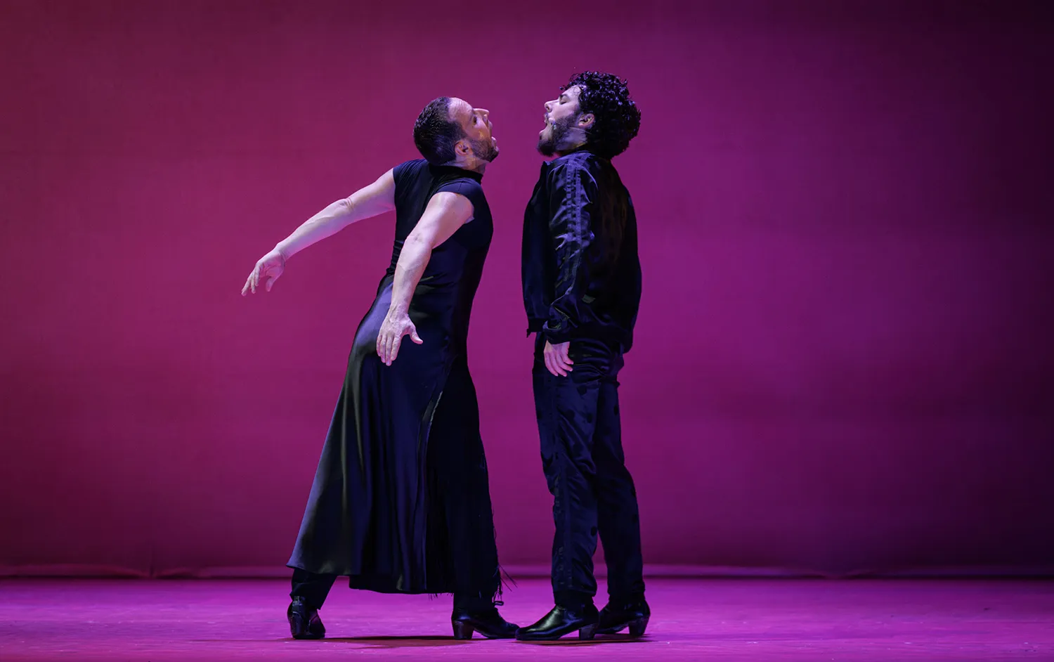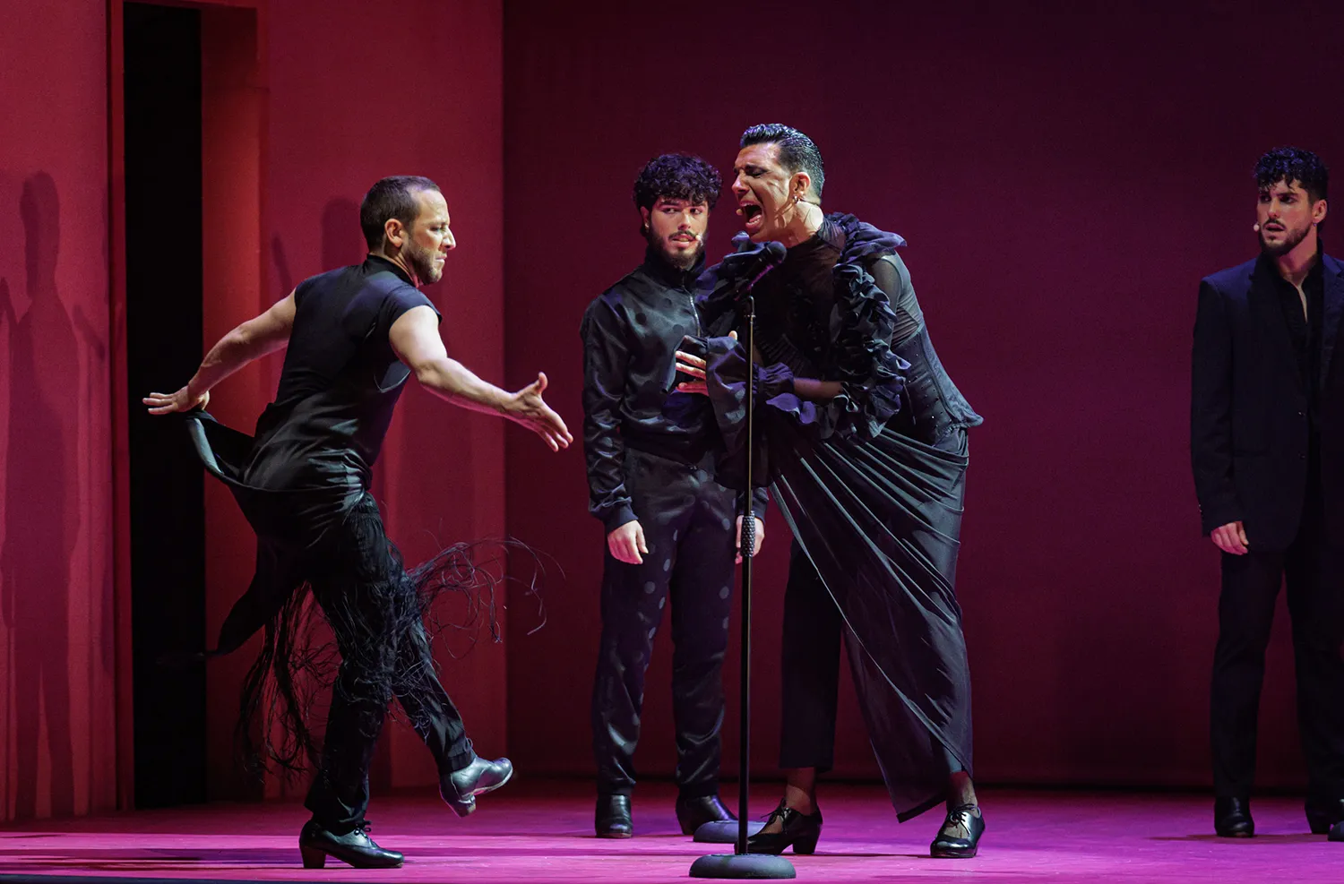 El escenario presenta dos paredes en L de matices malvas, rosas y naranjas, todos ellos brillantes, sobre las que destacan los artistas vestidos de negro que fueron ocupando el escenario a las órdenes del maestro Liñán. Ahora todos, ahora uno sólo, ahora dos o los que sean necesarios. Ahora el cante se resguarda entre los músicos a un lado del escenario, casi pasando desapercibidos en la oscuridad del proscenio. Ahora cantando alante, ofreciendo el cante al bailaor.