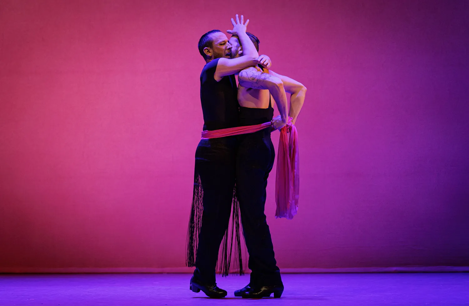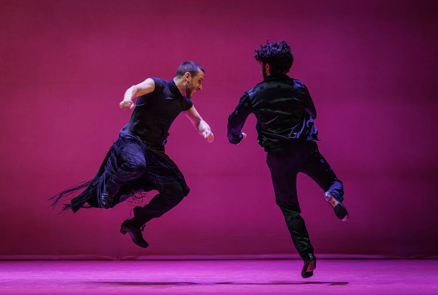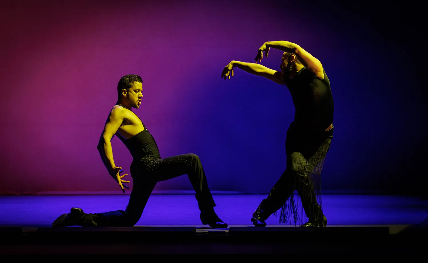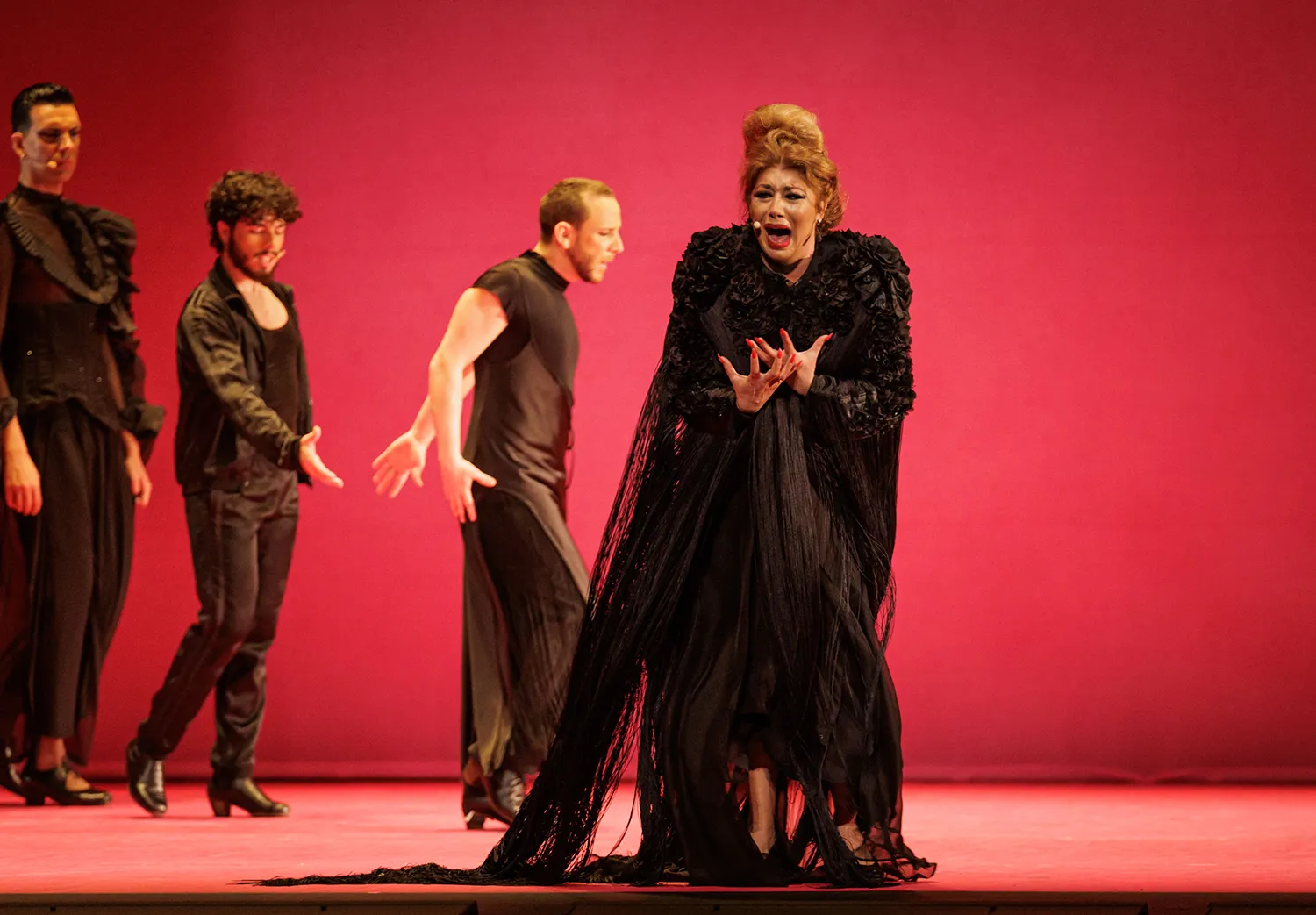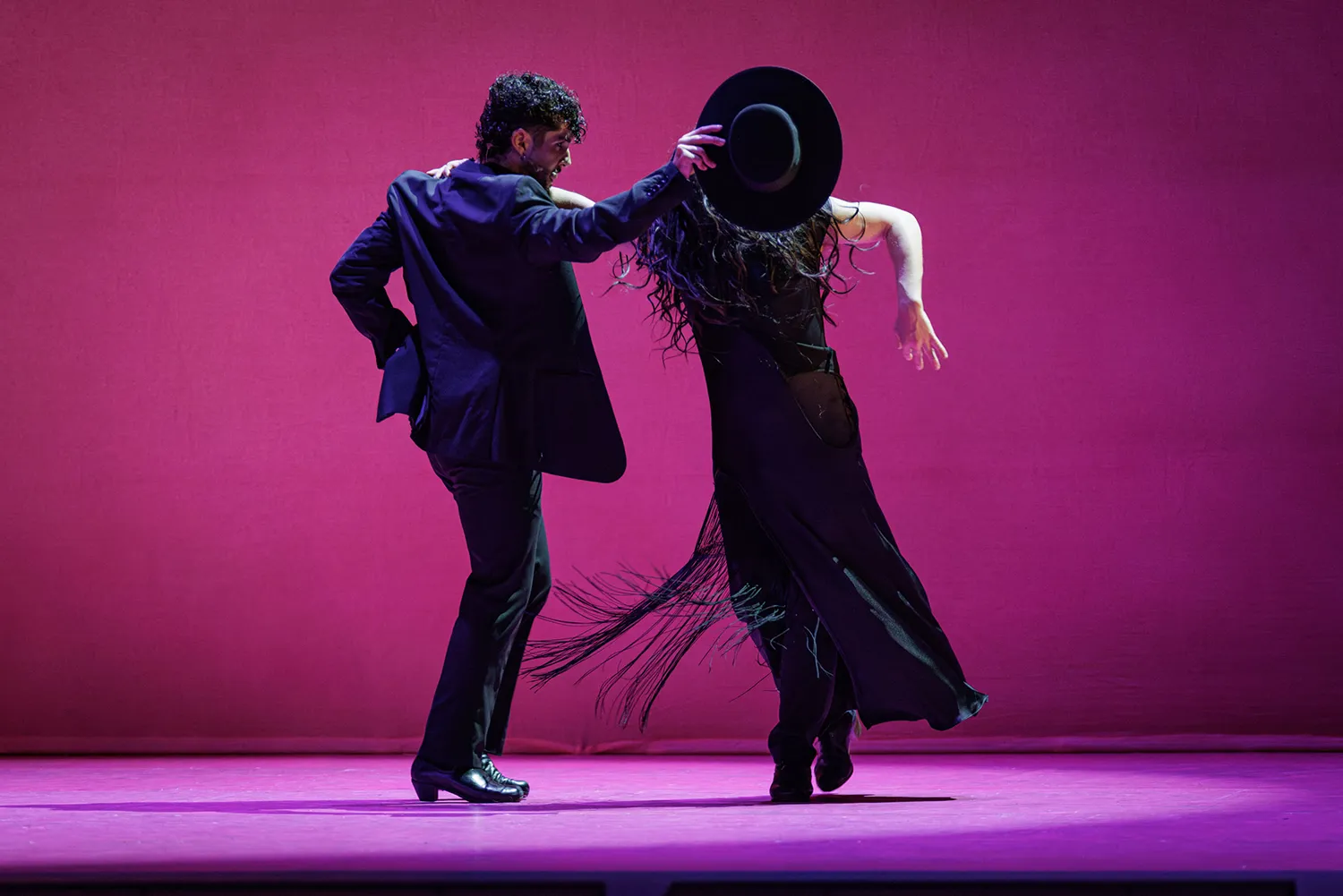 El escenario presenta dos paredes en L de matices malvas, rosas y naranjas, todos ellos brillantes, sobre las que destacan los artistas vestidos de negro que fueron ocupando el escenario a las órdenes del maestro Liñán. Ahora todos, ahora uno sólo, ahora dos o los que sean necesarios. Ahora el cante se resguarda entre los músicos a un lado del escenario, casi pasando desapercibidos en la oscuridad del proscenio. Ahora cantando alante, ofreciendo el cante al bailaor.