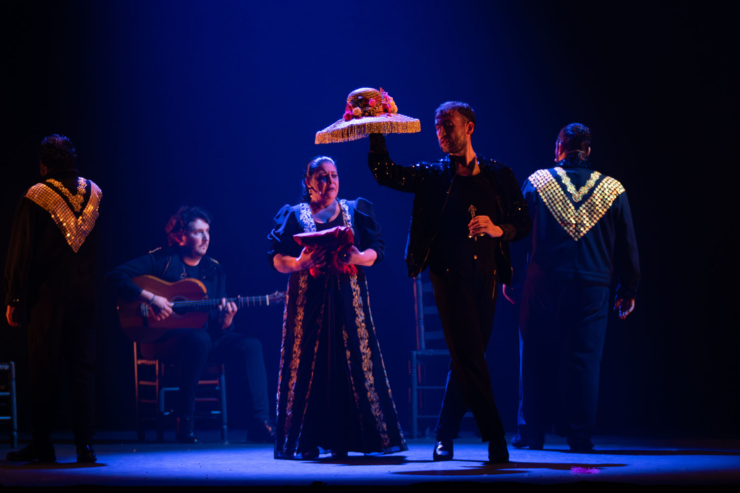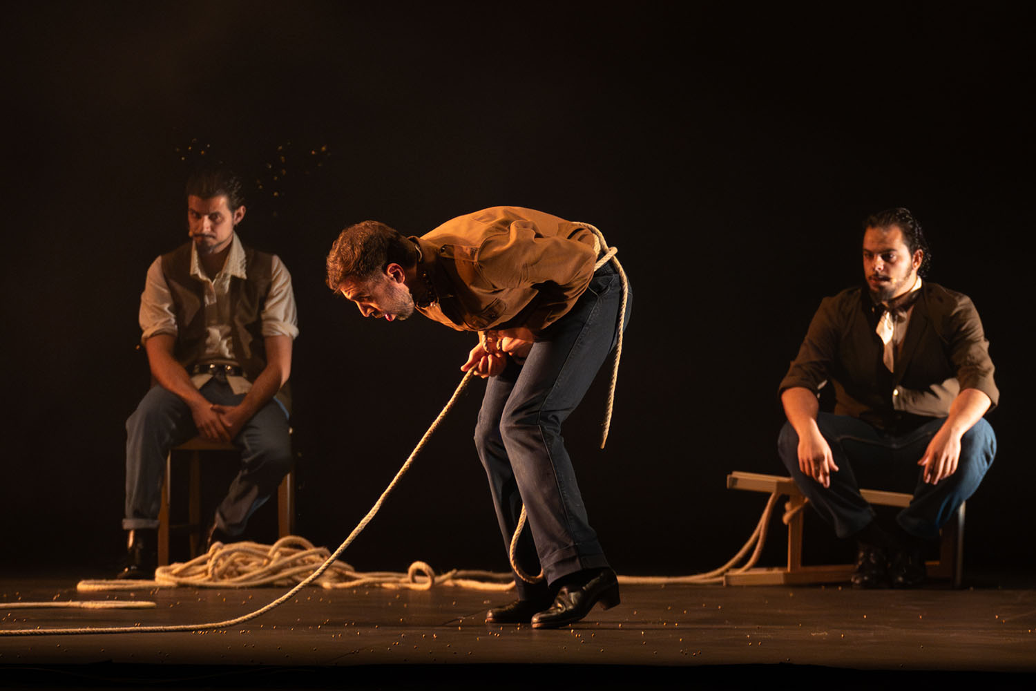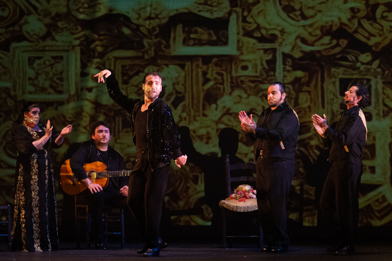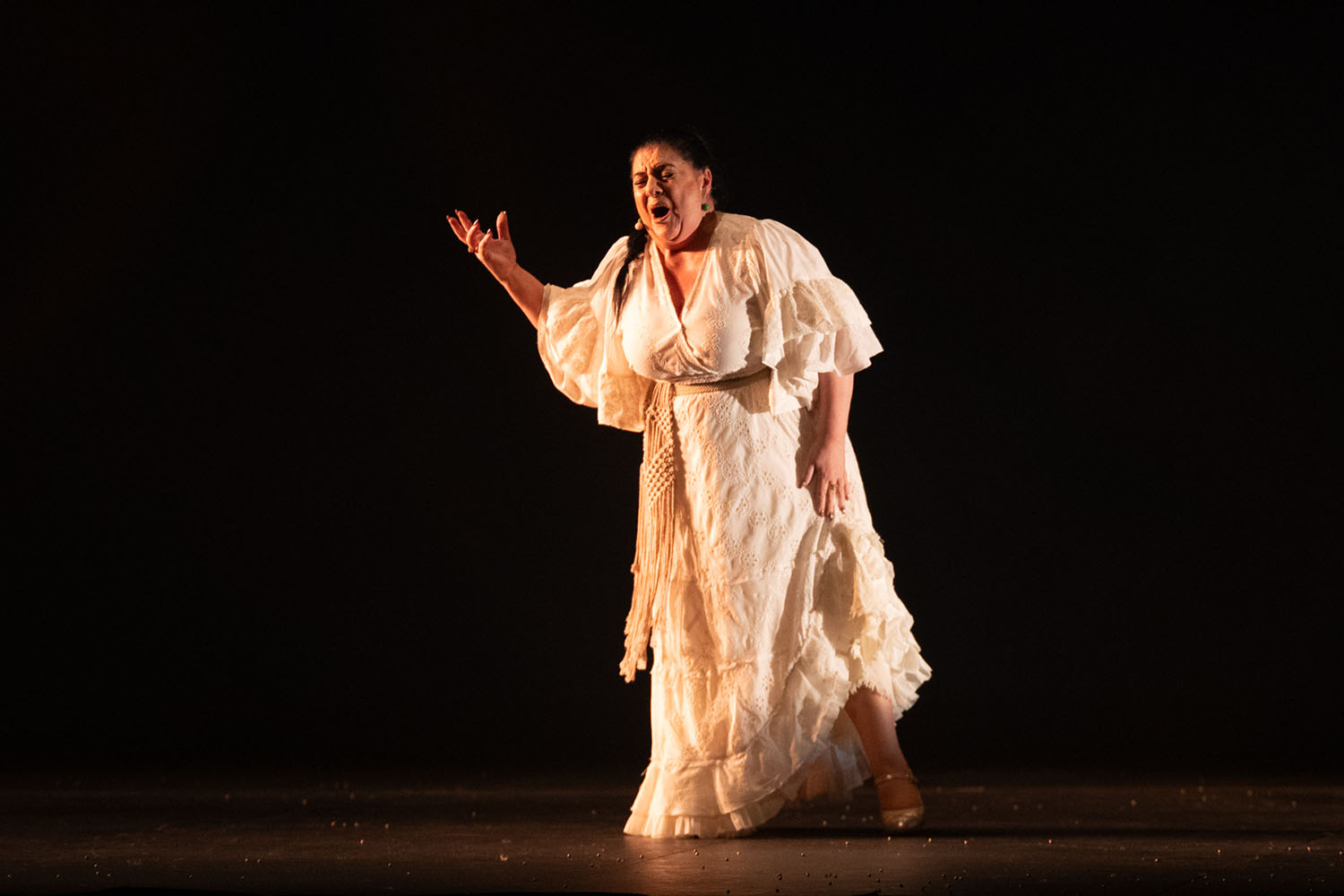 El bailaor emula a una yegua o un mulo, y pronto caen sobre él las cuerdas que quieren domarlo. La sombra de Gades y Mario Maya planea fugazmente sobre el escenario, pero es solo un instante. El arcense quiere explorar un vasto territorio de la herencia musical de la que viene, de la que venimos todos, y se adentra en el cuplé y el bolero. Una impetuosa Chelo Pantoja ataca Pena, penita, pena en la tierra de Lola Flores, que es también la suya, y el teatro vuelve a venirse abajo.