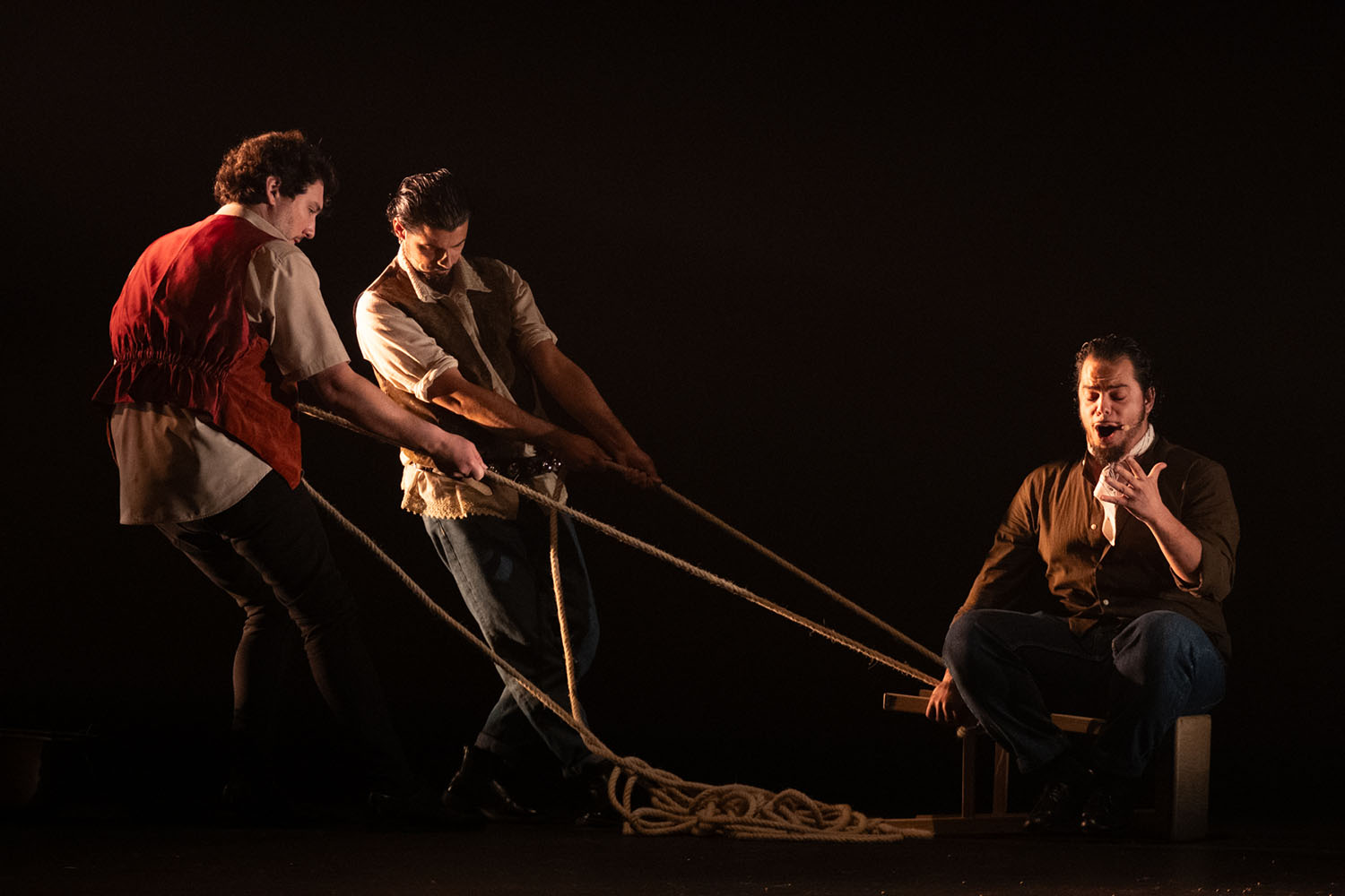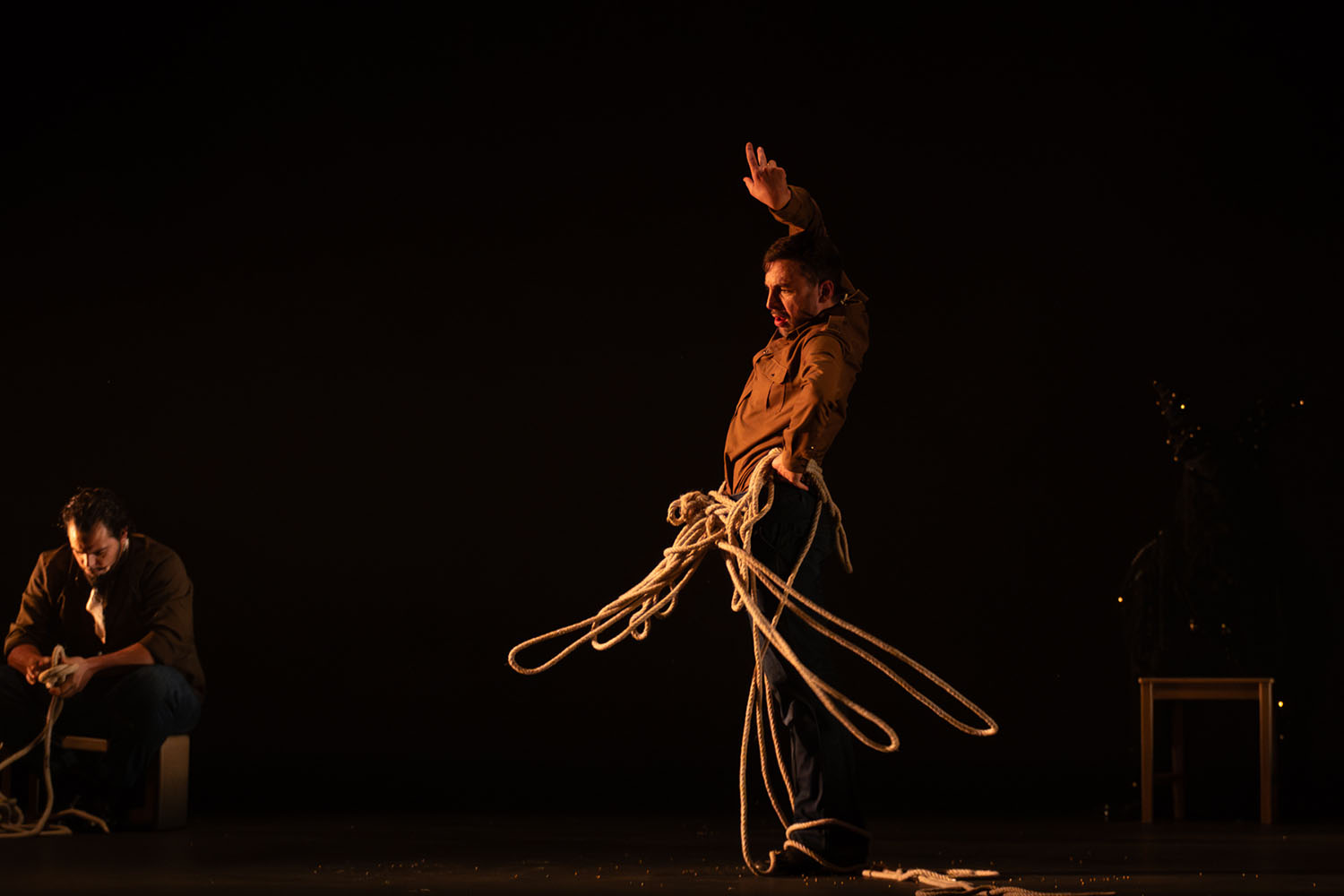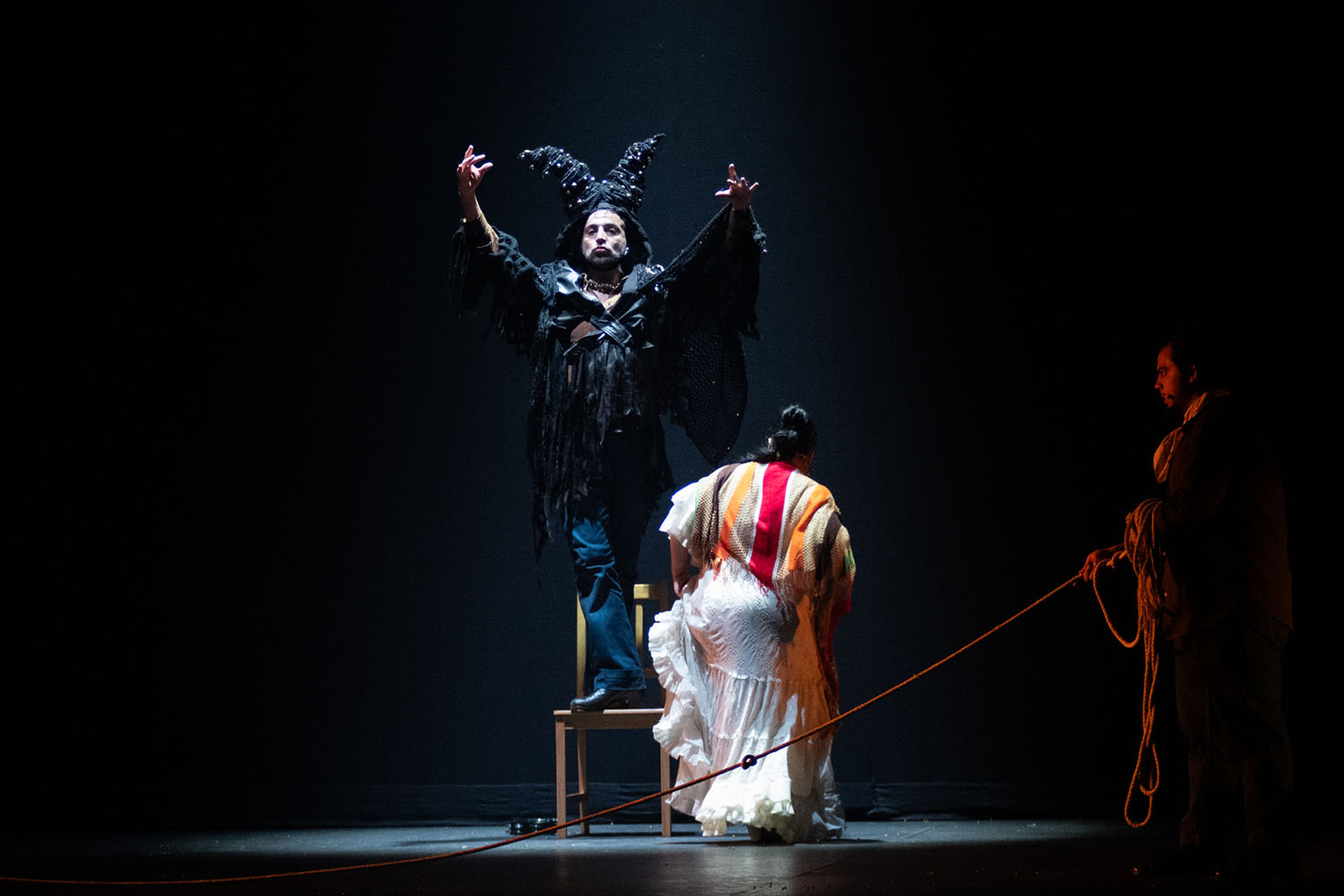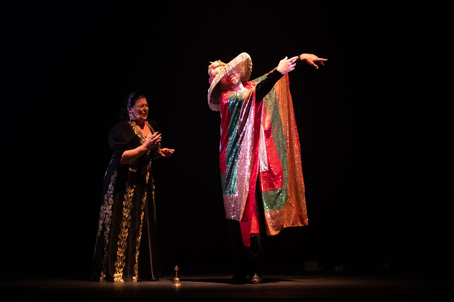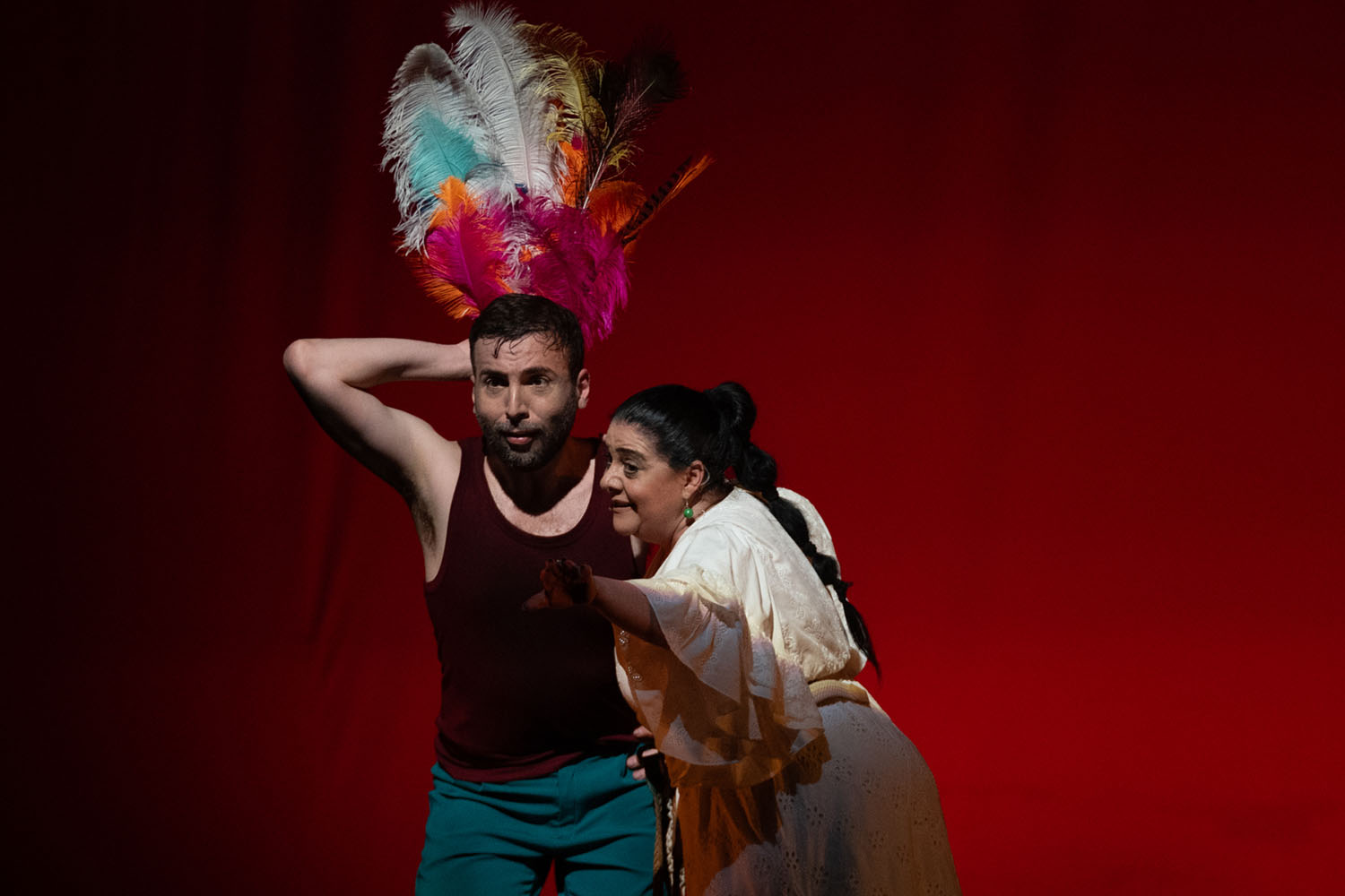 El bailaor emula a una yegua o un mulo, y pronto caen sobre él las cuerdas que quieren domarlo. La sombra de Gades y Mario Maya planea fugazmente sobre el escenario, pero es solo un instante. El arcense quiere explorar un vasto territorio de la herencia musical de la que viene, de la que venimos todos, y se adentra en el cuplé y el bolero. Una impetuosa Chelo Pantoja ataca Pena, penita, pena en la tierra de Lola Flores, que es también la suya, y el teatro vuelve a venirse abajo.