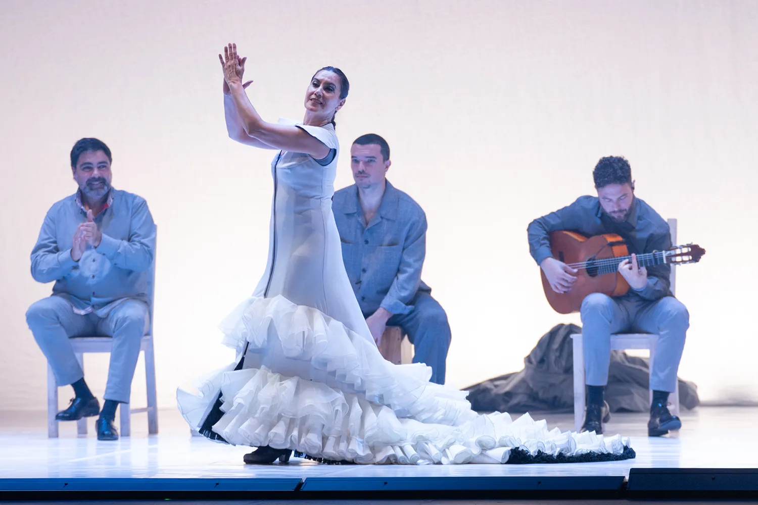 Este es el rasgo dominante en el montaje, que atiende, igualmente, a Polimnia, asociada a los cantos sagrados, y a Erató, la musa que inspira a guitarristas como Jesús Torres y José Luis Medina a fin de que Rafaela Carrasco evidencie desde la farruca cómo la propuesta a lo que aspira es envolver al espectador en una experiencia de intensa visualidad poética.