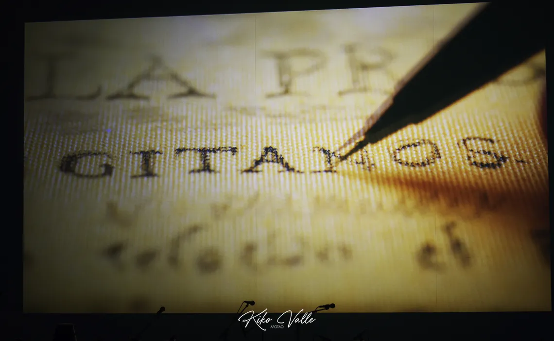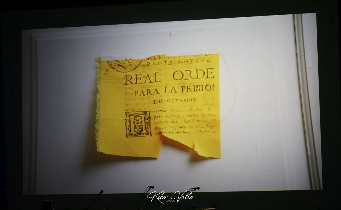 Aquello empezó con una proyección de la confección de la genial obra que sirvió de fondo de escenario, autoría del artista utrerano Antonio Rodríguez Ledesma, llena de simbología y significado en la que ha querido «plasmar la historia, cultura e identidad de un pueblo con siglos de presencia en nuestro país, hecha con textiles que simbolizan los 600 años del pueblo gitano, desde sus orígenes nómadas hasta su asentamiento en Utrera». También resalta que «a través de réplicas y elementos significativos, se reflejan momentos históricos clave, oficios tradicionales, la Hermandad de Los Gitanos de Utrera y su vinculación con la ciudad. Todas las piezas están unidas por un hilo rojo que representa la sangre, tanto la derramada en su camino como la que une a las culturas con el tiempo. No es solo un cartel sobre los gitanos, sino un homenaje a la integración cultural que Utrera representa. Y la bandera, desgastada y simbólica, se cierra con la rueda del carro hecha con un pañuelo rojo de Fernanda de Utrera».